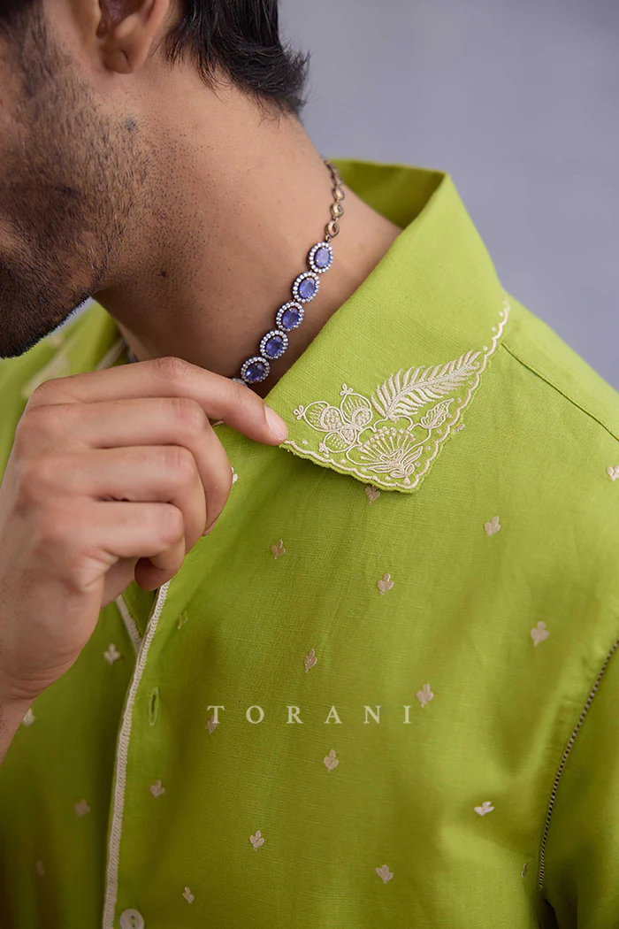 The Angoori Divakar Kameez Set is crafted with bright, parrot-green linen fabric that boasts intricately embroidered tropical motif. The set features a kameez and pants, and makes for the perfect outfit for a summer getaway.