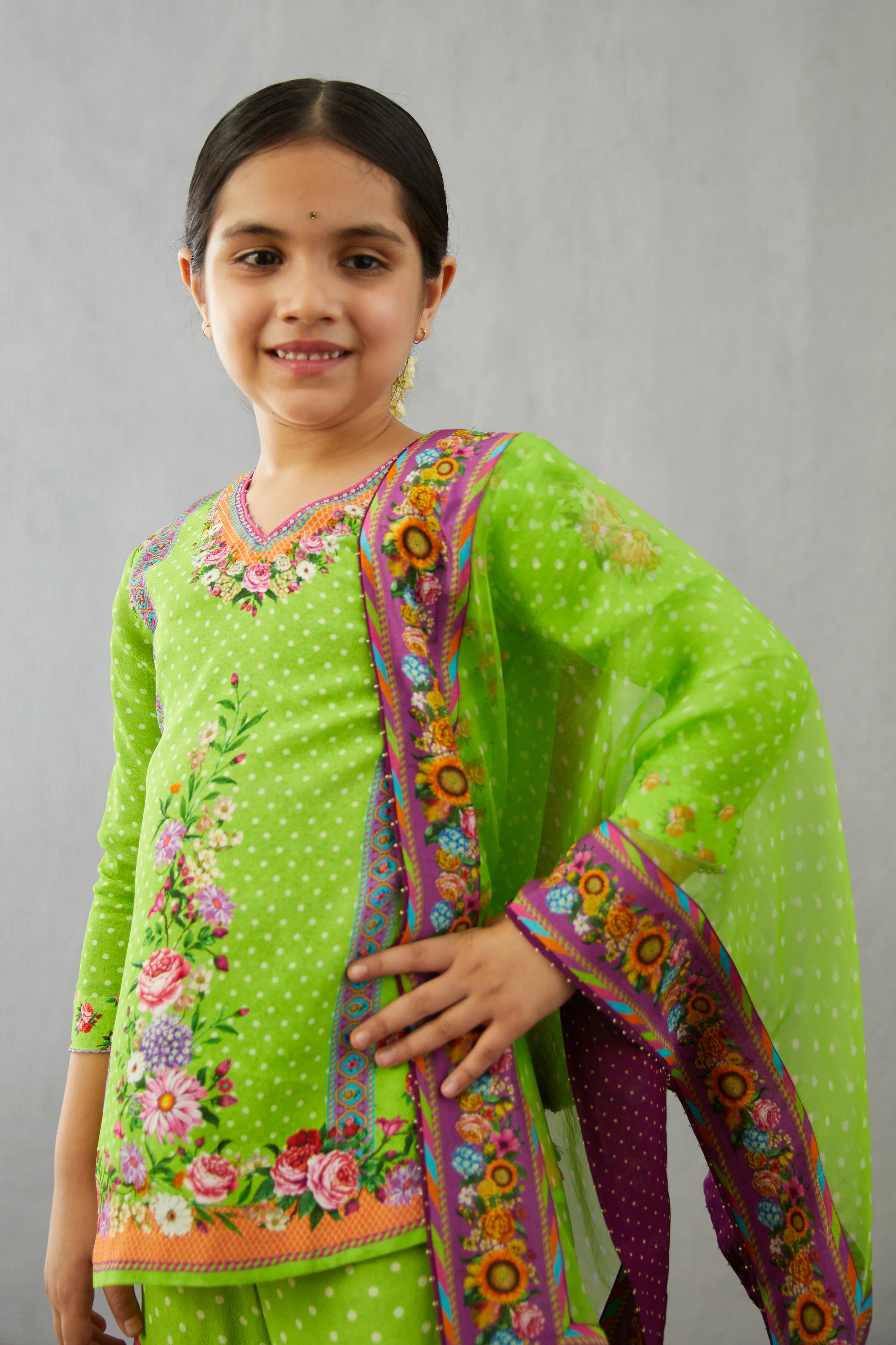 The Angoori Hansara Sharara Set is a beautiful combination of contemporary design and opulence. Crafted from a blend of georgette, cotton silk, and handwoven chanderi fabrics, this set includes a kurta, pants and an odhni, all in a stunning green color. The set is further delicately detailed with a combination of digital and hand block prints. Perfect for elevating any look.