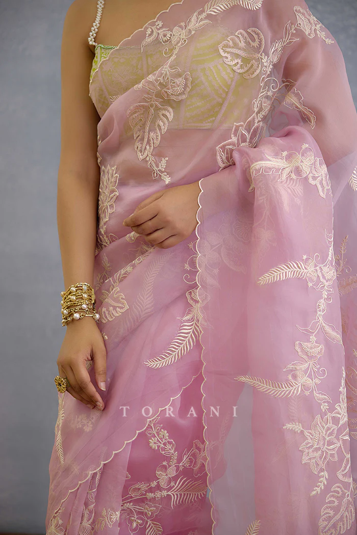The exquisitely designed Bakaayan Pankhuri Saree is crafted with a lightweight organza fabric, and is intricately decorated with hand and dori embroidery. The soft lilac shade of this saree makes it a staple for your summer fiestas and more.