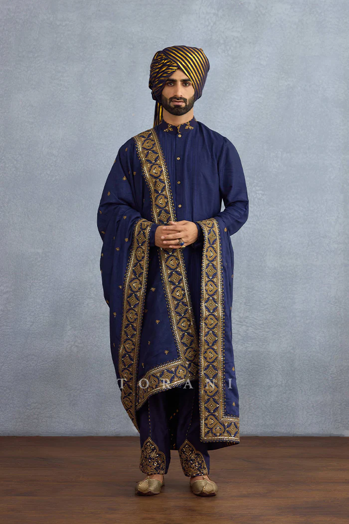 The Behare Vasl Doshala is crafted with the finest jeni silk, and features a gorgeous navy blue shade, that is punctuated with intricate doria, dabka and other embellishments for a unique finish.