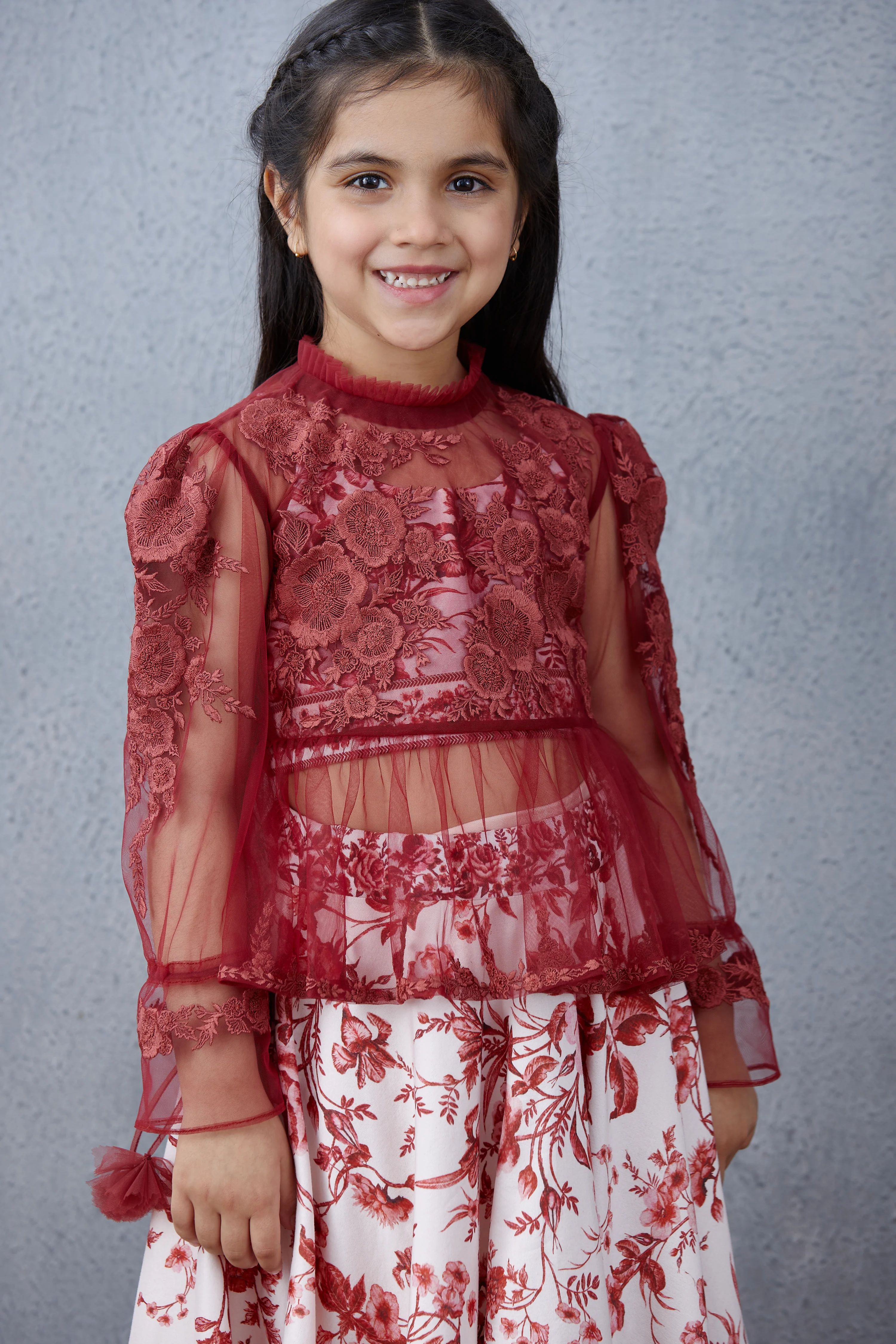 Look stunning in this traditional Bhuri Gauraiya Poulami Lehenga Set. Made from handwoven Chanderi and Silk Organza fabric, the set includes a Lehenga, Blouse, and Bralette, all featuring Aari Embroidery and a stylish Digital Print in a red hue. Perfect for traditional occasions, this set is sure to turn heads.