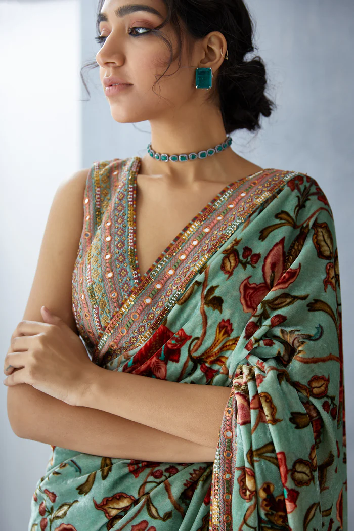 This Champa Makhmal Pallu Sheesha Revathi Saree is a stunning mix of silk velvet and organza fabrics, delicately hand-embroidered for a unique touch of luxury. The green colour adds an eye-catching vibrancy that makes it an ideal showstopper for special occasions.