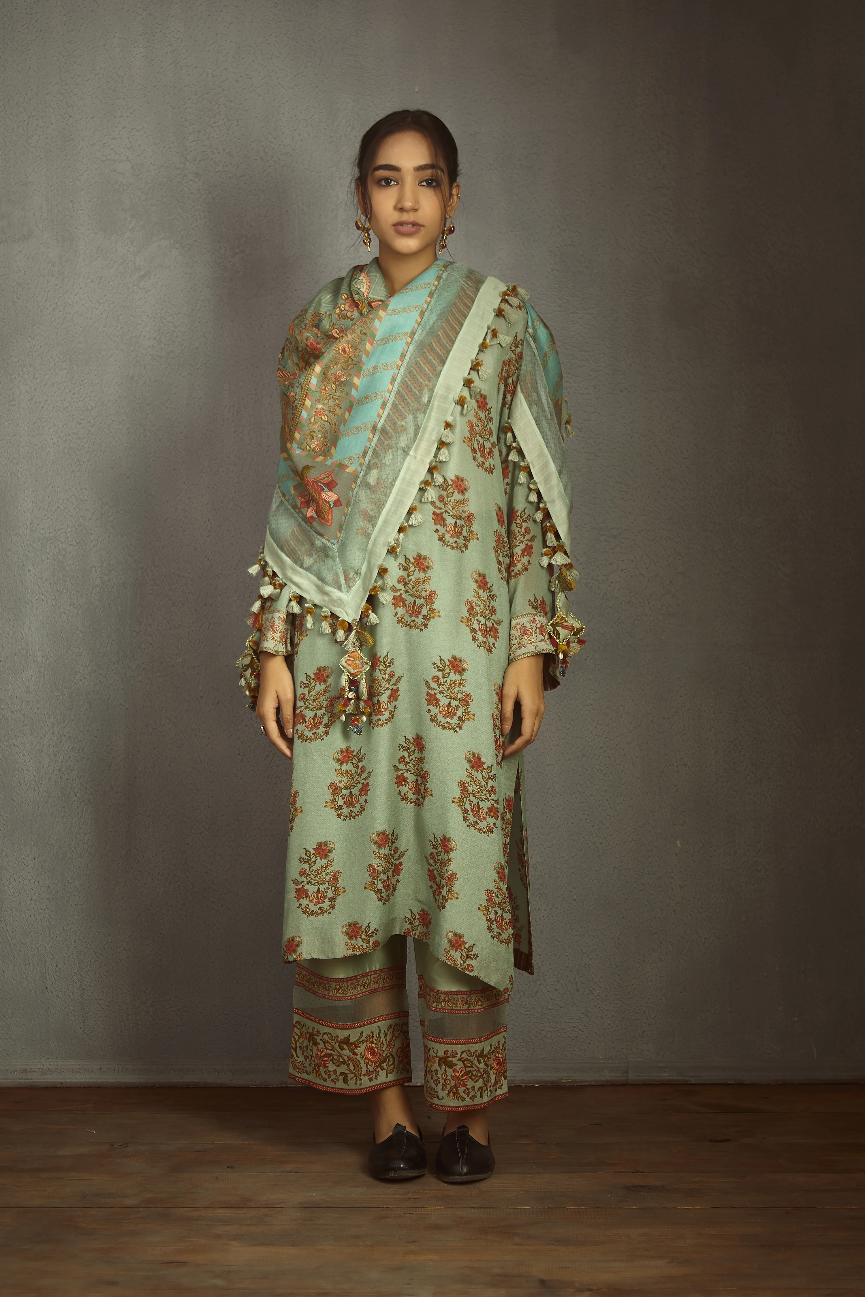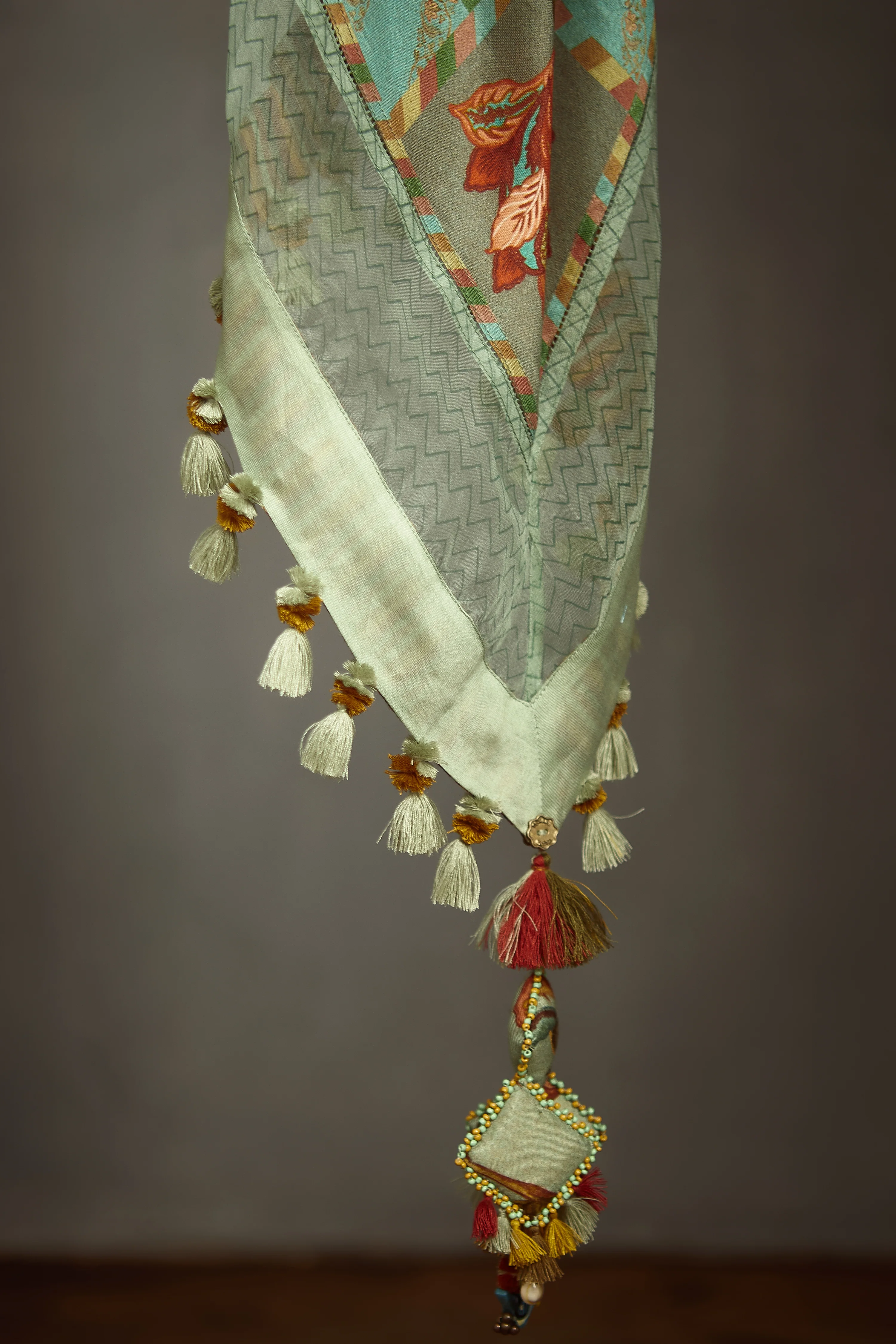 Enjoy this beautiful Champa Tree of Life Scarf designed with distinctive Chanderi, Cotton Silk, and Organza fabrics. The unique green hue creates a subtle pop of color, making this scarf perfect for any occasion. It's the perfect addition to complete any outfit.