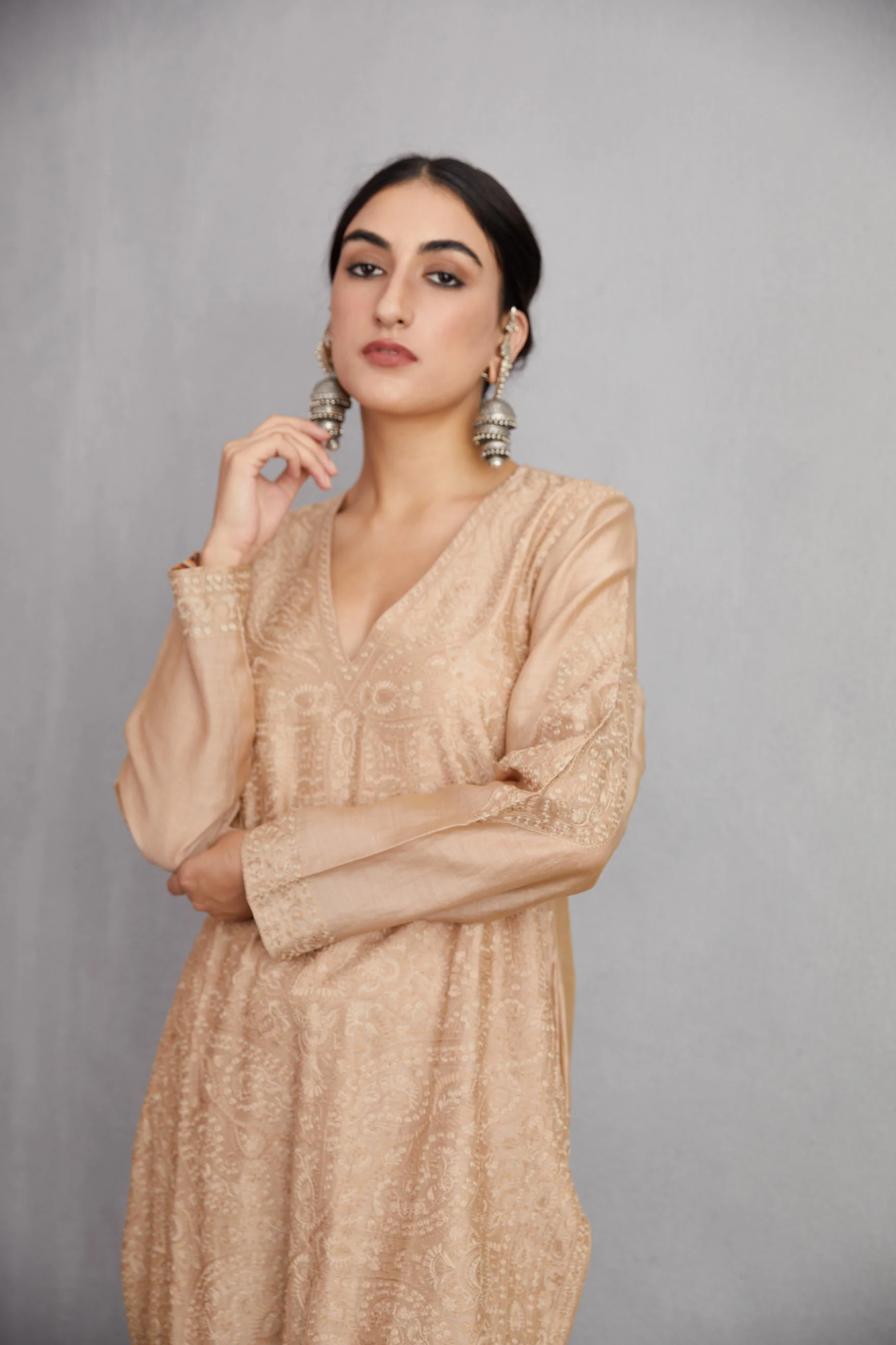 The Chandan Sahiba Co-ord Set is crafted with a blend of handwoven Chanderi and cotton voile for a lightweight, breathable fit. The beige hue makes for a timeless addition to any wardrobe, and the Aari embroidery adds classic texture. The set comes with a comfortable kurta and pants for a complete look.