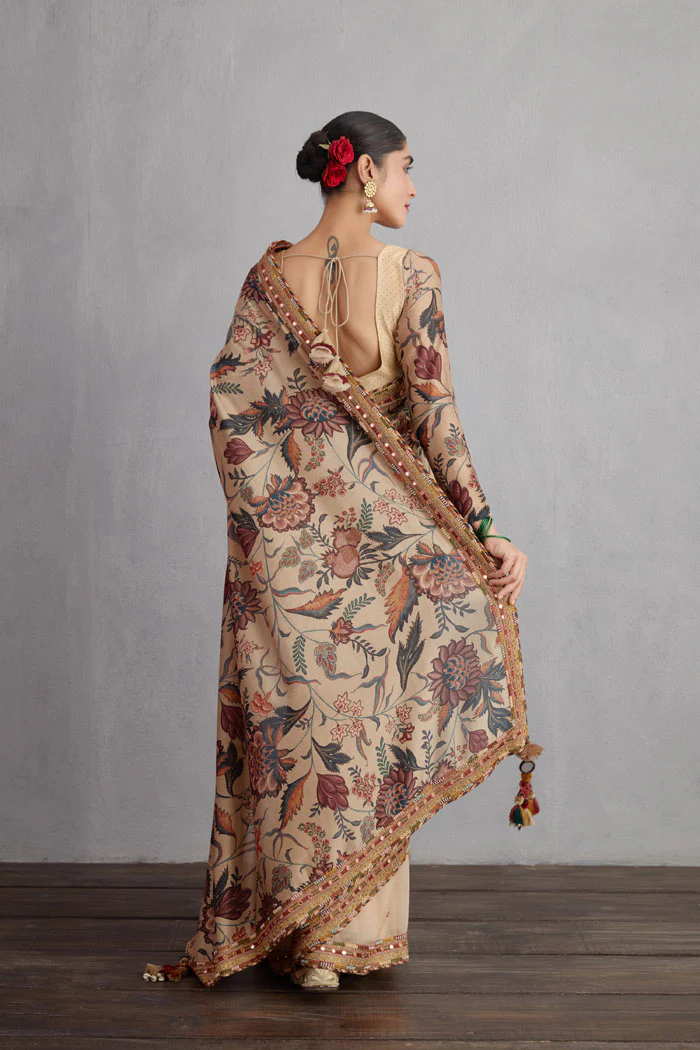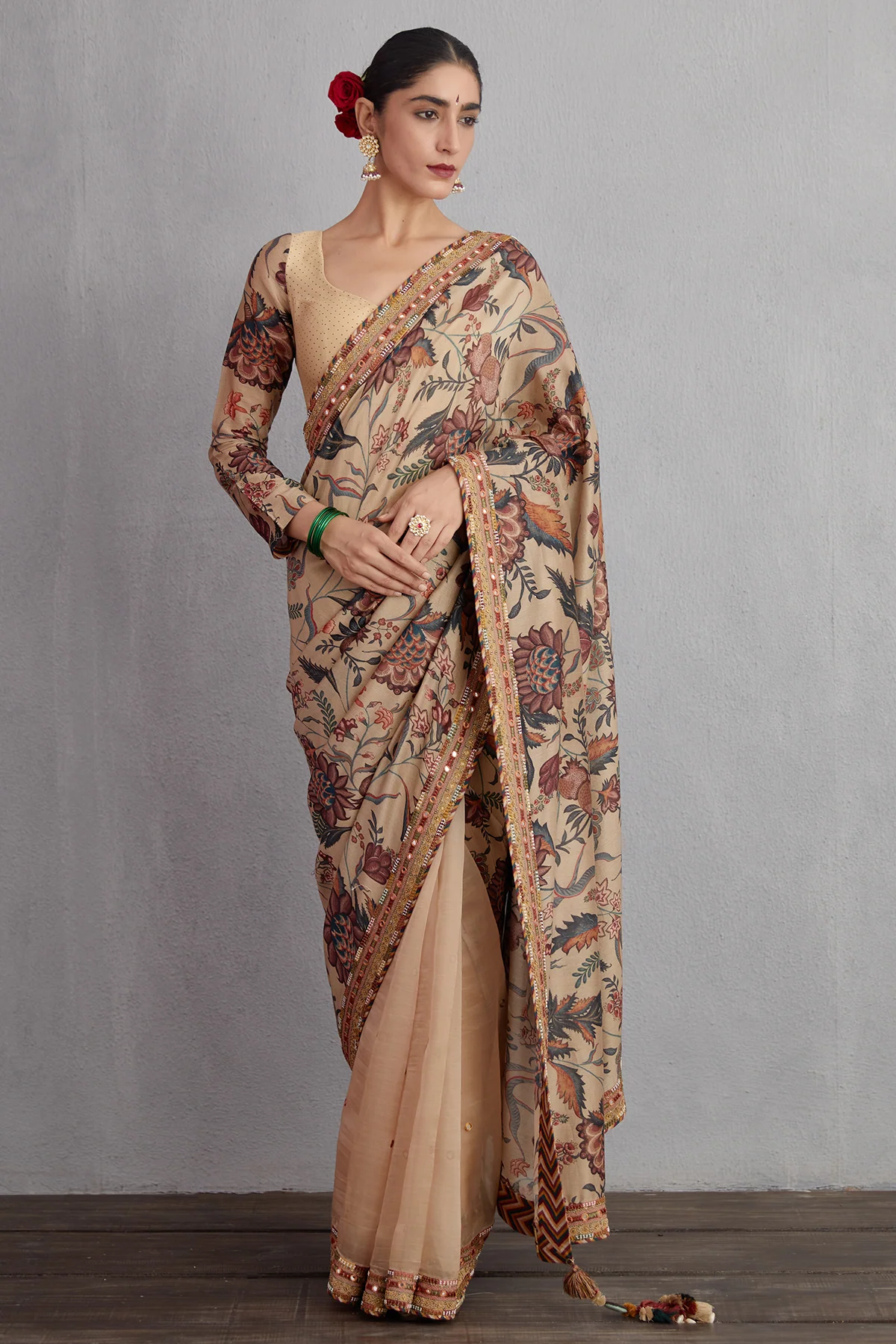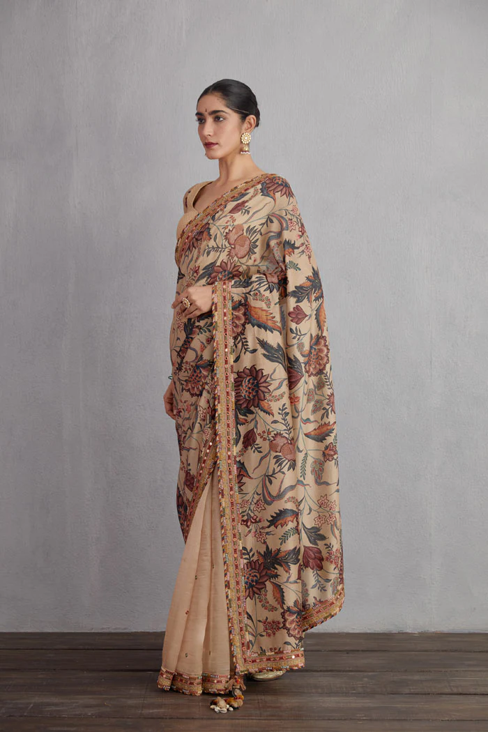 Look stunning in this natural beige Chandan Sheesha Revathi Saree. Crafted from handwoven Chanderi and Cotton Silk, this saree is adorned with beautiful Hand Embroidery to provide a touch of subtle elegance. With its easy-to-care for fabric, this saree is a perfect pick for your special occasions.