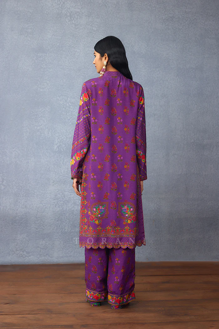 With a classic neckline design, the Dil Kusha Zainab Kurta Set is a statement piece for your closet. The beautiful printed slub silk kurta and pants is paired with a gorgeous purple organza odhni, printed and accented with a scalloped border.