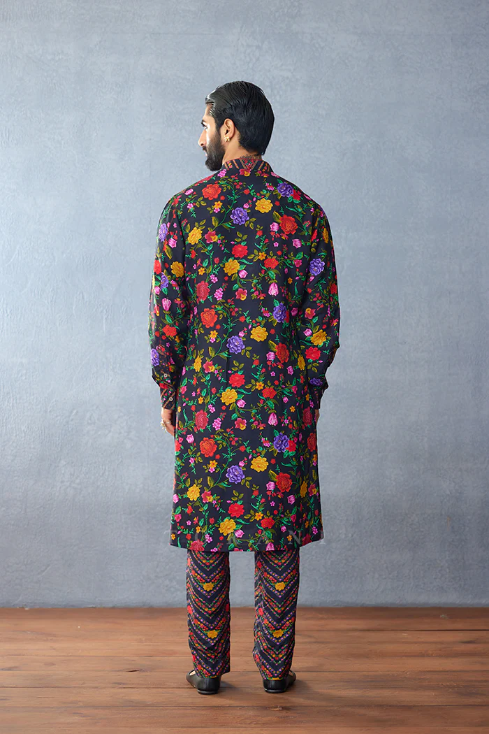 The Dil Shaad Nasir Kurta Set is a statement of modern luxury in its make. Comprising of a kurta with a maximalist, one-of-a-kind prints crafted in jeni silk and muslin silk pants in a deep vintage black tone, the set is bound to stand out in its modern approach to traditional menswear.