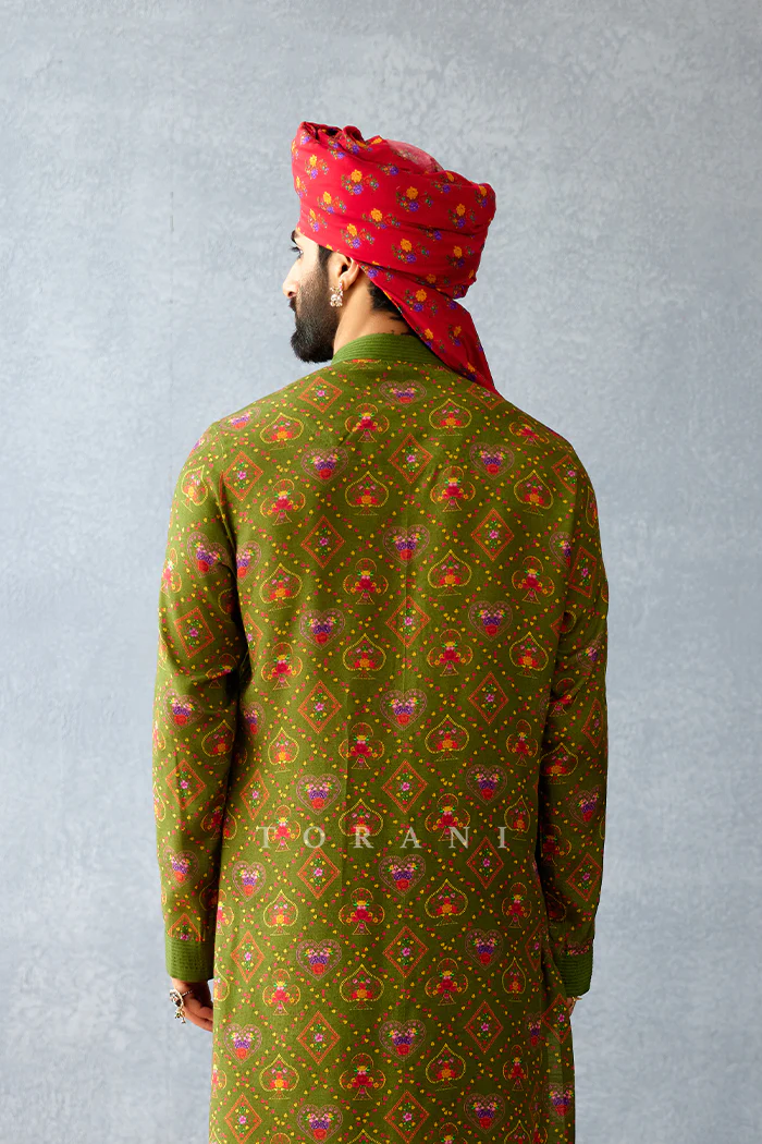 This Dil Surkh Aziz Saafa is the perfect choice for special occasions. Crafted with Jeni Silk, the Topi sports Torani exclusive festive prints. The beautiful red color makes this a truly eye-catching piece.Â