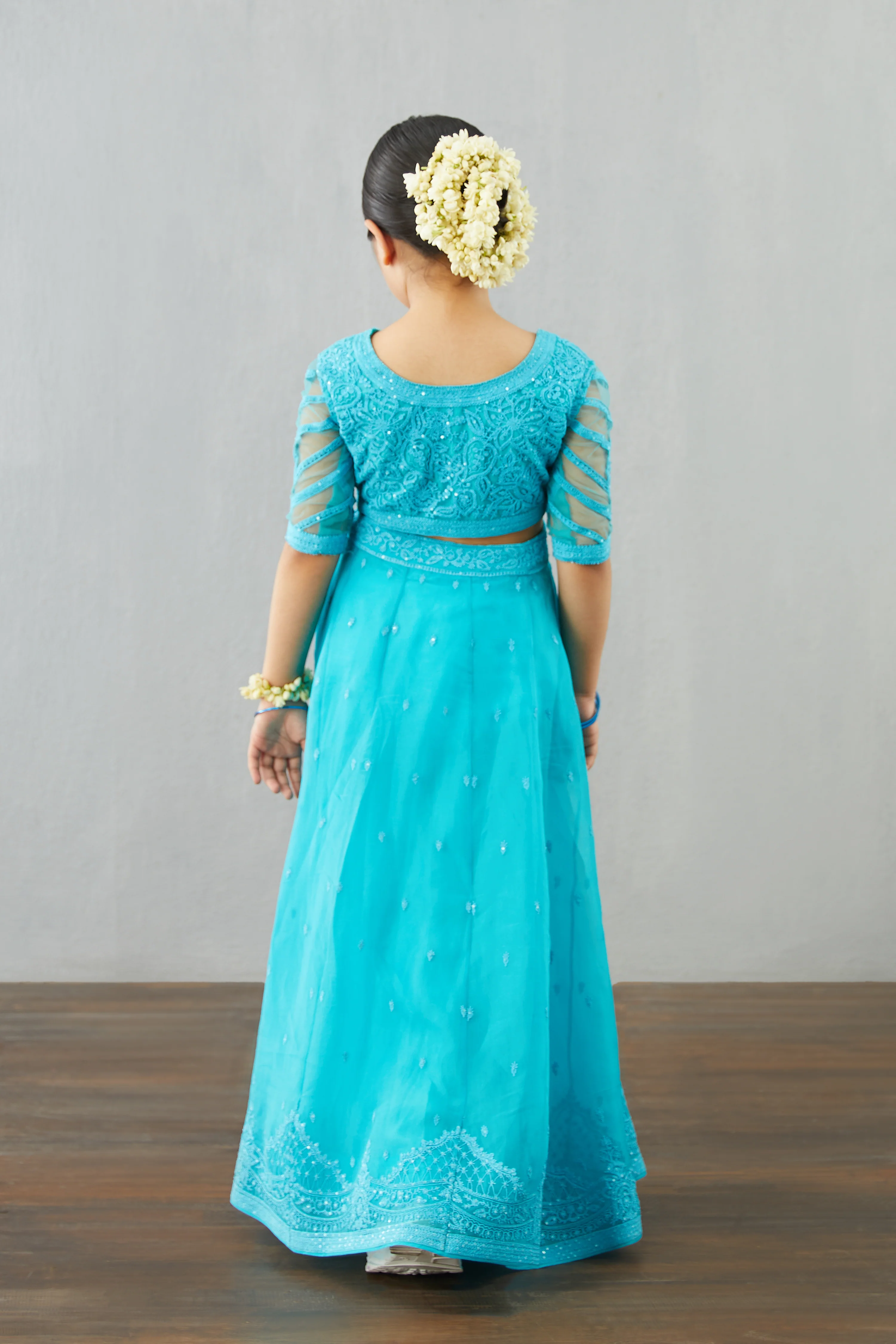 Crafted in airy silk organza, cotton silk, and butterfly net, the Firoza Eknoor Lehenga Set will make you look and feel glamorous. The blue ensemble is embellished with intricate aari embroidery and hand adda work, and consists of a lehenga, blouse, and odhni. With quality craftsmanship and fine touches, this set is sure to turn heads.