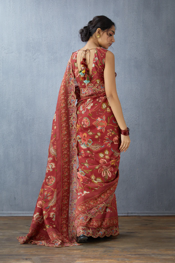 The Gudhal Enakshi Saree is a luxurious piece of clothing, crafted from a combination of handwoven Chanderi and Silk Organza fabric. The vivid red color is enhanced by digital print, Aari embroidery, and hand block print work. The Gudhal Enakshi Saree is perfect for making a statement of elegance and refinement.