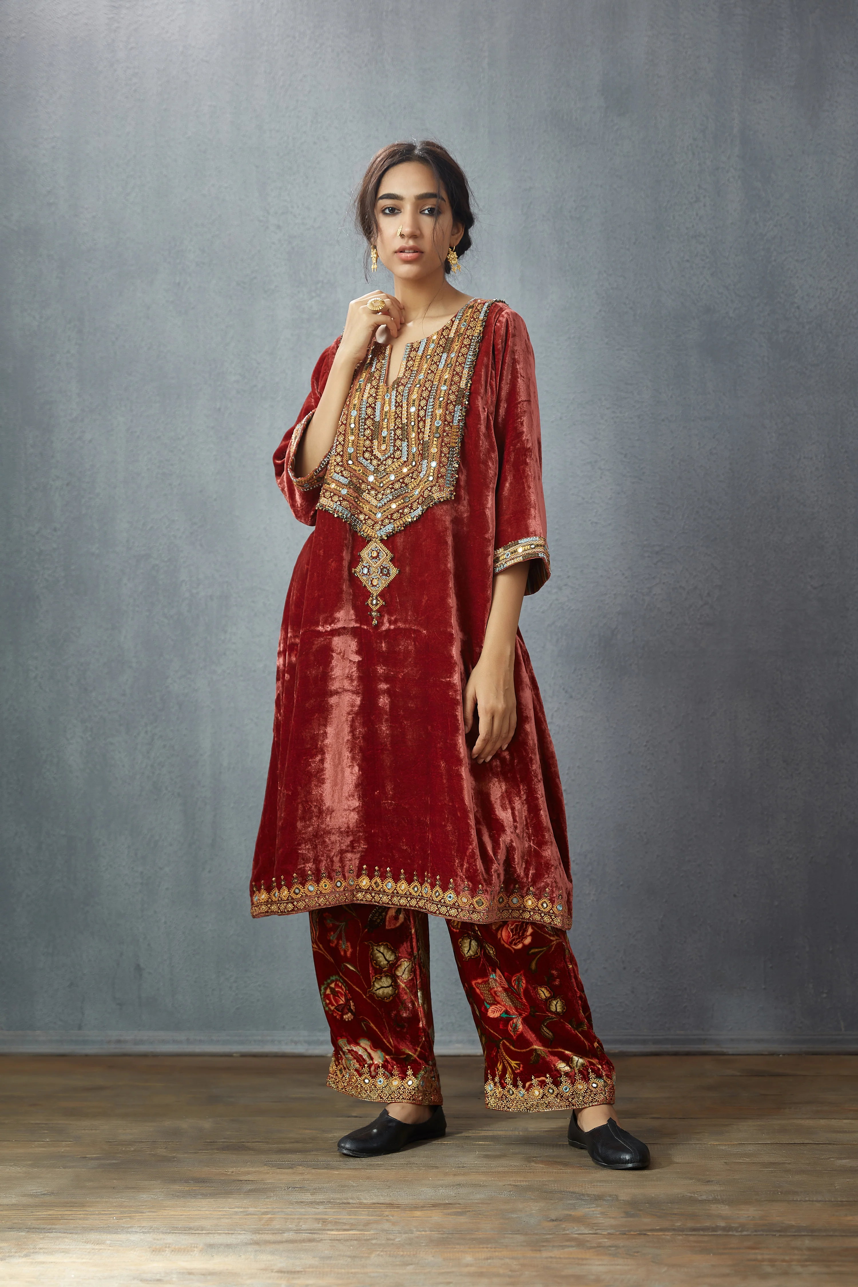 This stylish Gudhal Makhmal Paakizah Co-ord Set is crafted from luxurious Silk Velvet fabric and comes in a vibrant red hue. It is decorated with both hand and machine embroidery that adds a hint of elegance to its timeless design. Perfect for a traditional look!