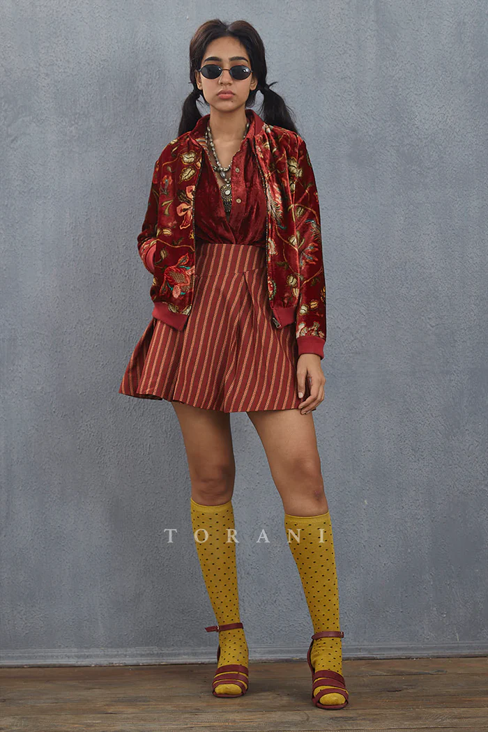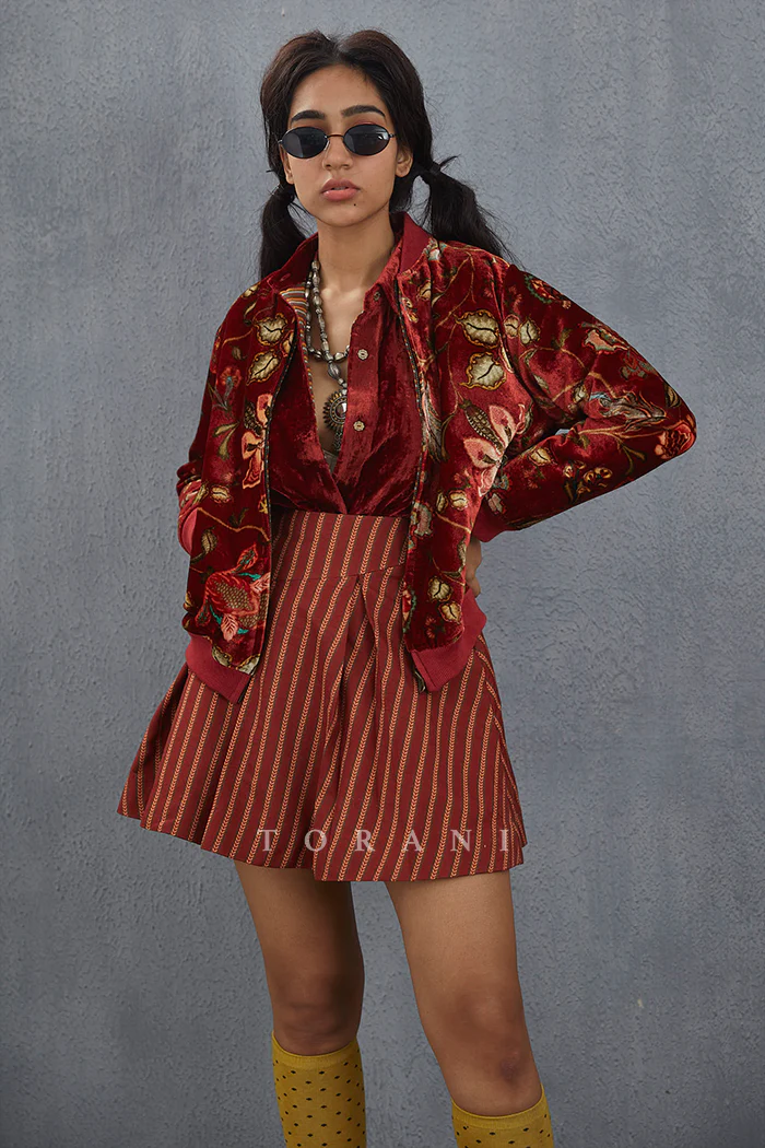 The Gudhal Parveen Bomber Jacket is the perfect addition to any wardrobe. Featuring a luxurious blend of Silk Velvet and Cotton Silk, this bomber jacket is soft and comfortable to wear. The bright shade of red is boldly printed with a Digital print that brings out the details of the fabric. With its beautiful craftsmanship, this bomber jacket is sure to turn heads.