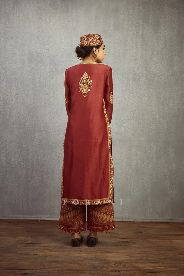 This traditional Gudhal Sindhi Topi is Handwoven in a beautiful blend of Chanderi and Cotton Silk with Aari Embroidery detailing. The rich red color makes this piece a timeless classic for any wardrobe. Enjoy the perfect mix of comfort, elegance, and style.