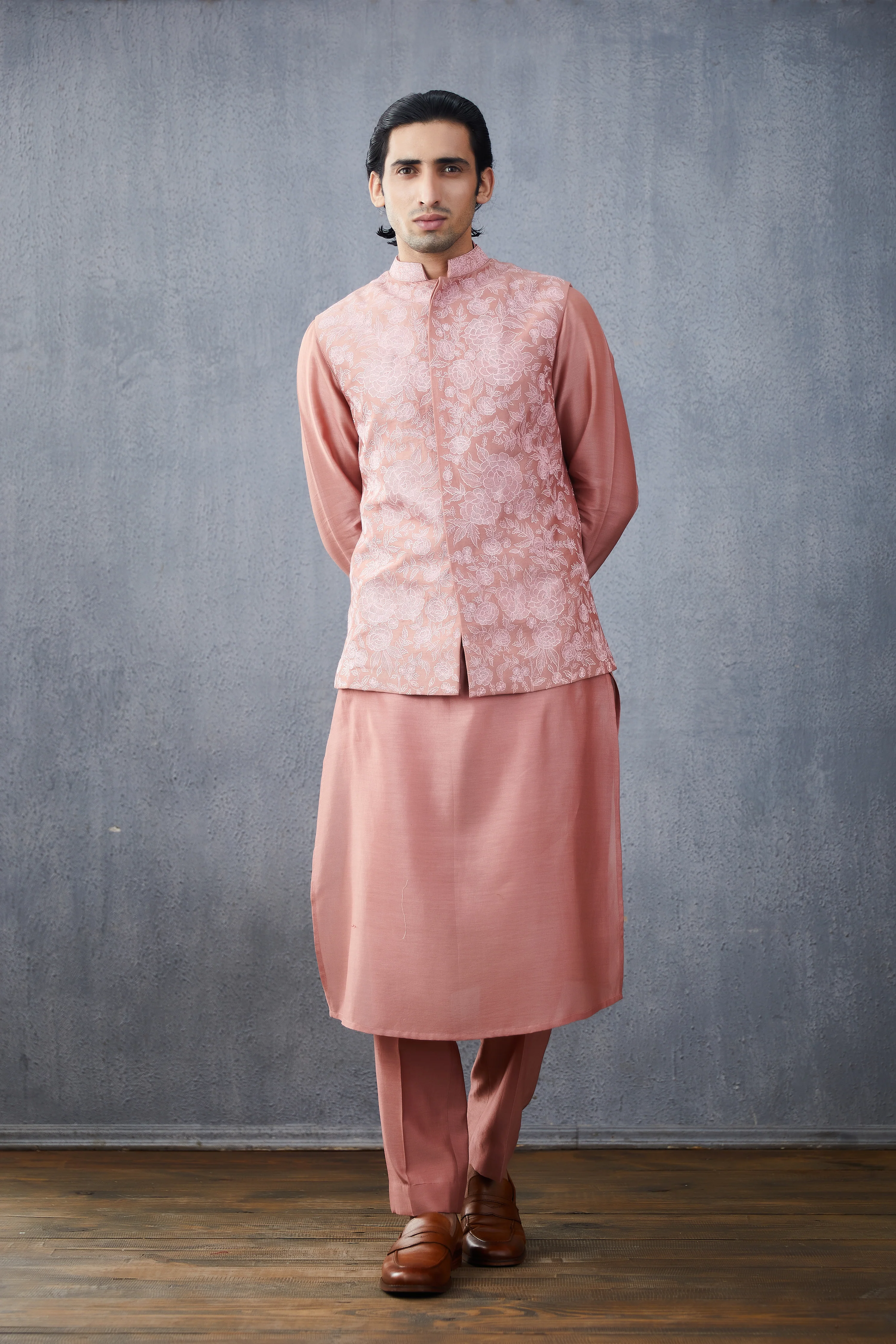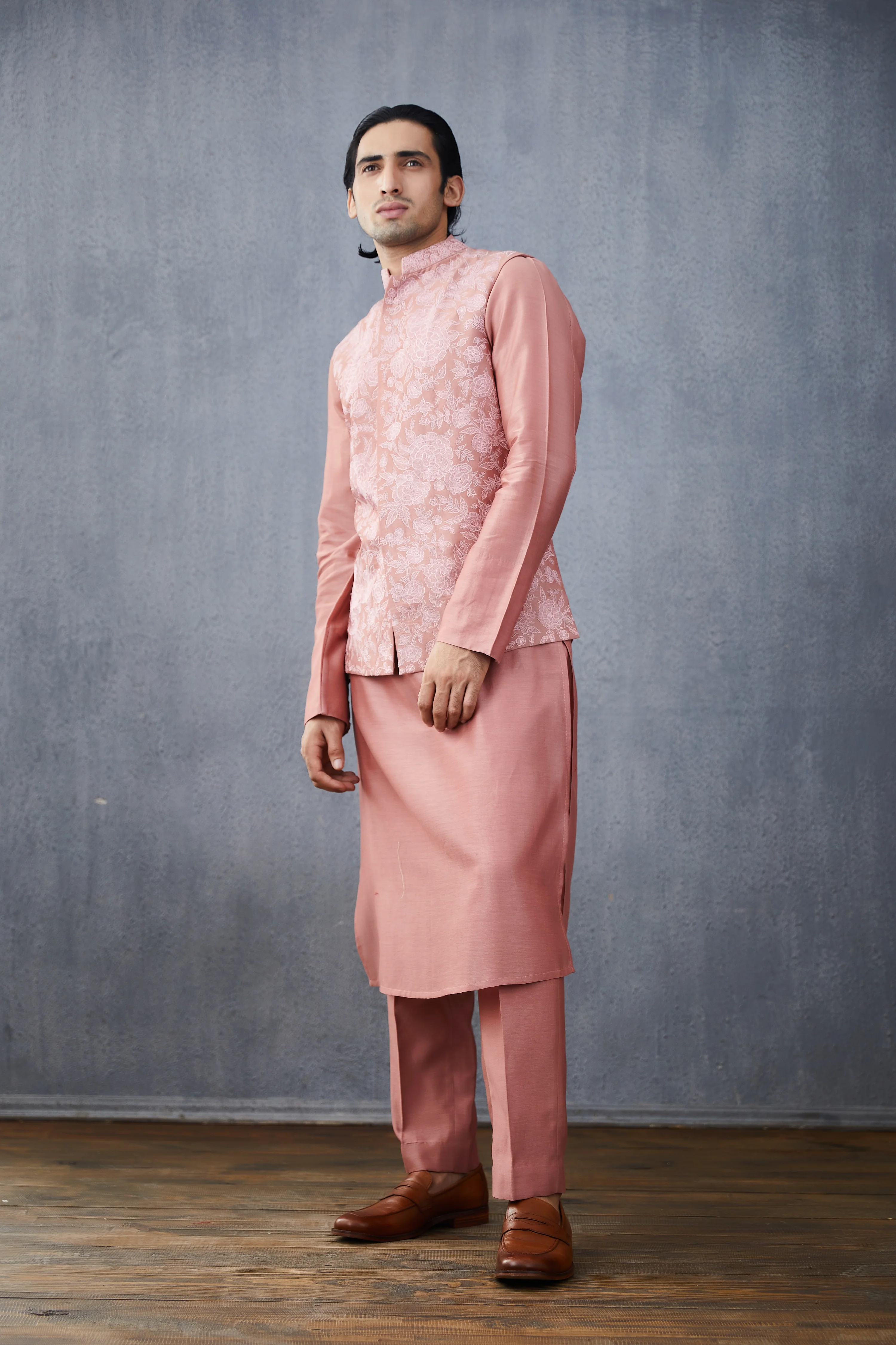 This exquisite Gulbaag Faiz Bandi is handcrafted with a blend of luxurious fabrics of Handwoven Chanderi, Cotton Voile and Cotton Silk. It features intricate dori embroidery work with hand adda and hand block print in a beautiful pink colour. An impressive design to elevate the style quotient for any special occasion.