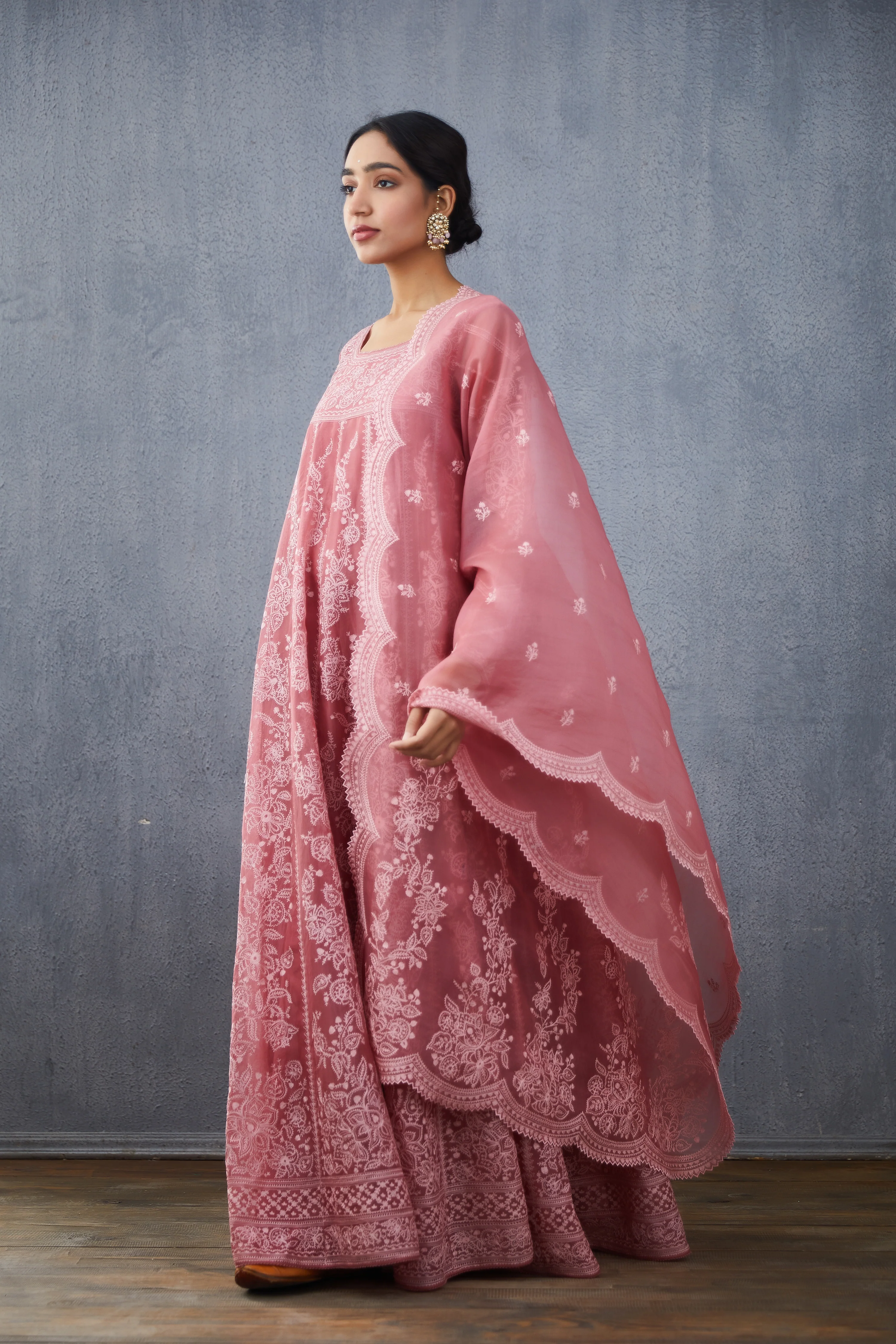Adorn yourself with this gorgeous Gulbaag Sutlej Odhni. Crafted from a blend of luxurious Silk Organza and Cotton Silk, this Odhni is intricately adorned with Aari embroidery. In a stunning pink hue, this will surely be a show stopper. Pair it with your traditional attires for the perfect look.
