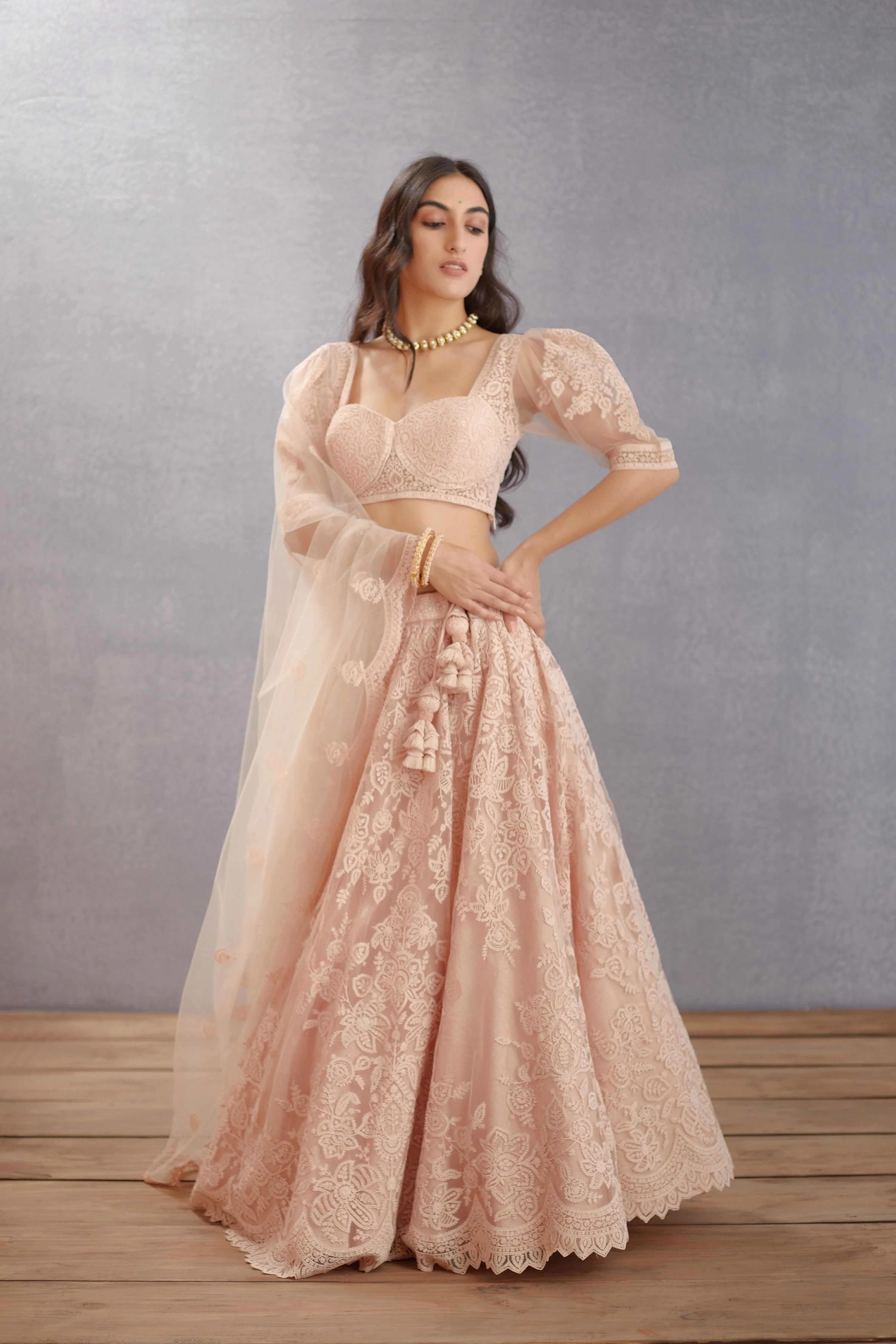 This Gulbahar Hansini Odhni is a beautiful, timeless piece for a traditional look. Featuring old rose pink Dori embroidered scallop borders draped on Butterfly Net fabric, this Odhni is an elegant addition to your wardrobe. The intricate embroidery and its soft hue make it perfect for any special occasion.