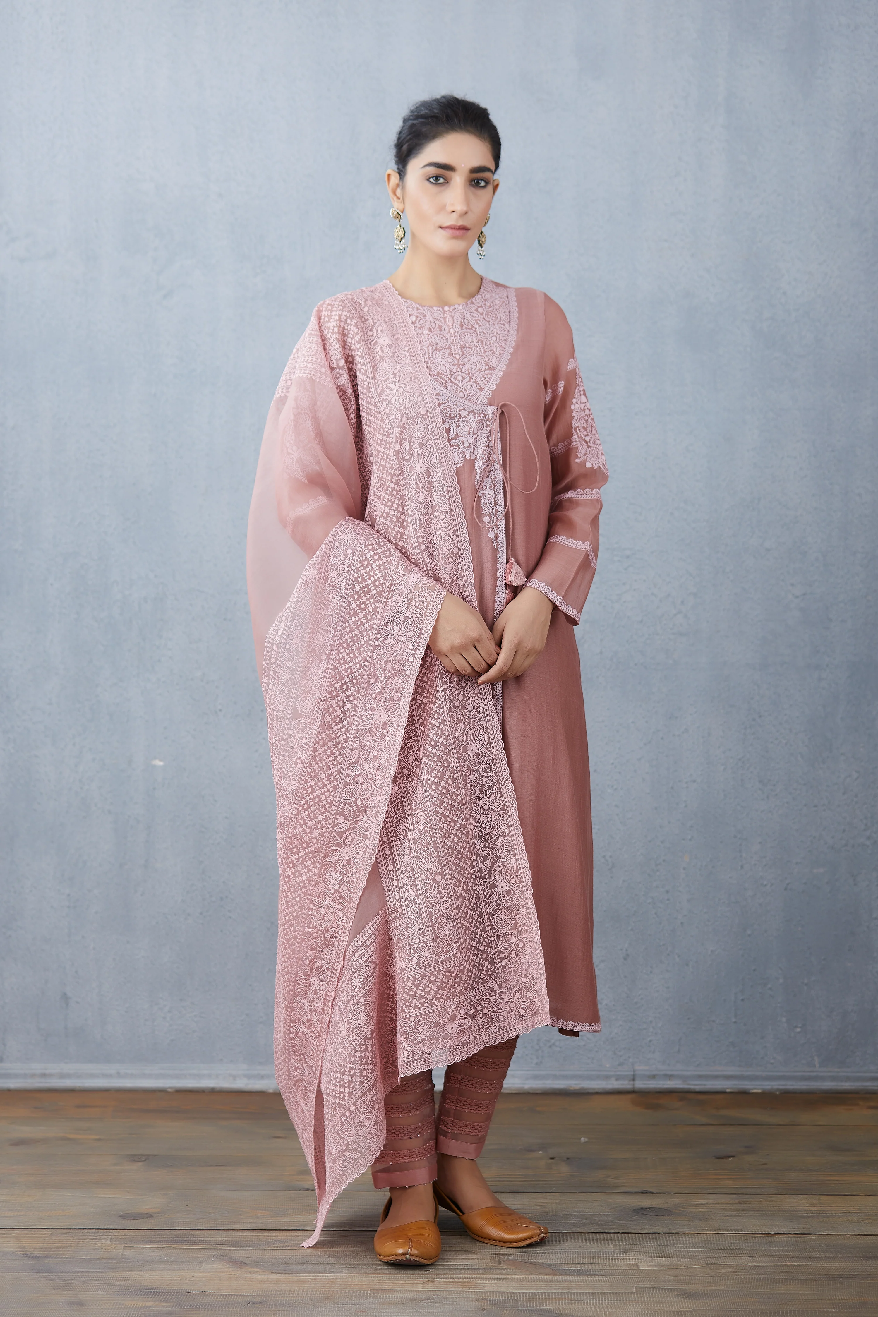 Bring a touch of royalty to your wardrobe with the Gulbahar Kiyah Kurta Set. This 3-piece set features a pink cotton silk kurta, pants, and odhni with an intricate aari embroidery work. The set also incorporates handwoven chanderi and silk organza for a look that is truly timeless. Enjoy the elegant craftsmanship and classic design.