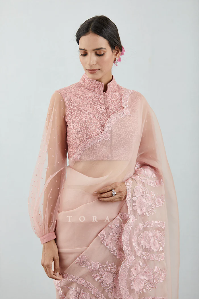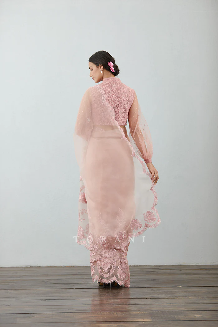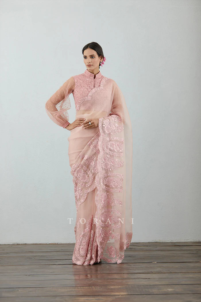 This Gulbahar Oshma Saree is a classic blend of style and elegance. Crafted from luxurious Silk Organza, this saree is accented with intricate Machine & Hand Embroidery for a touch of sophistication. The eye-catching carnation hue adds a dash of grace for any occasion.
