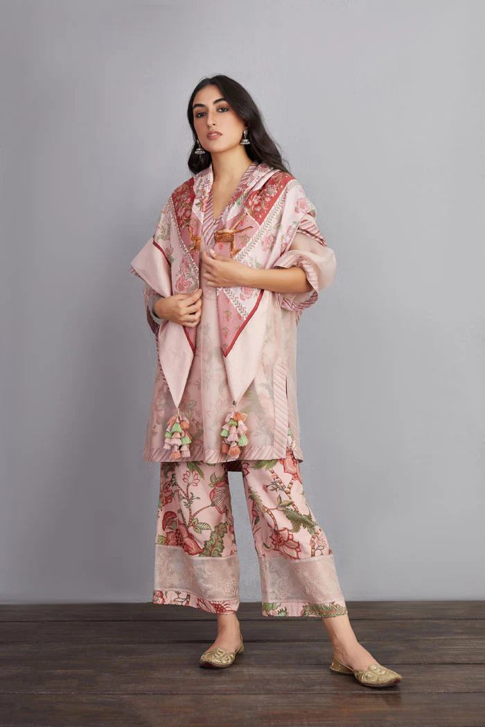 The Gulbahari Revathi Co-ord Set is an exquisite combination of handwoven Chanderi fabric and Cotton Voile in a beautiful shade of pink. The look is completed by intricate hand embroidery and digital print work. Exuding elegance and luxury, this set is perfect for all occasions.