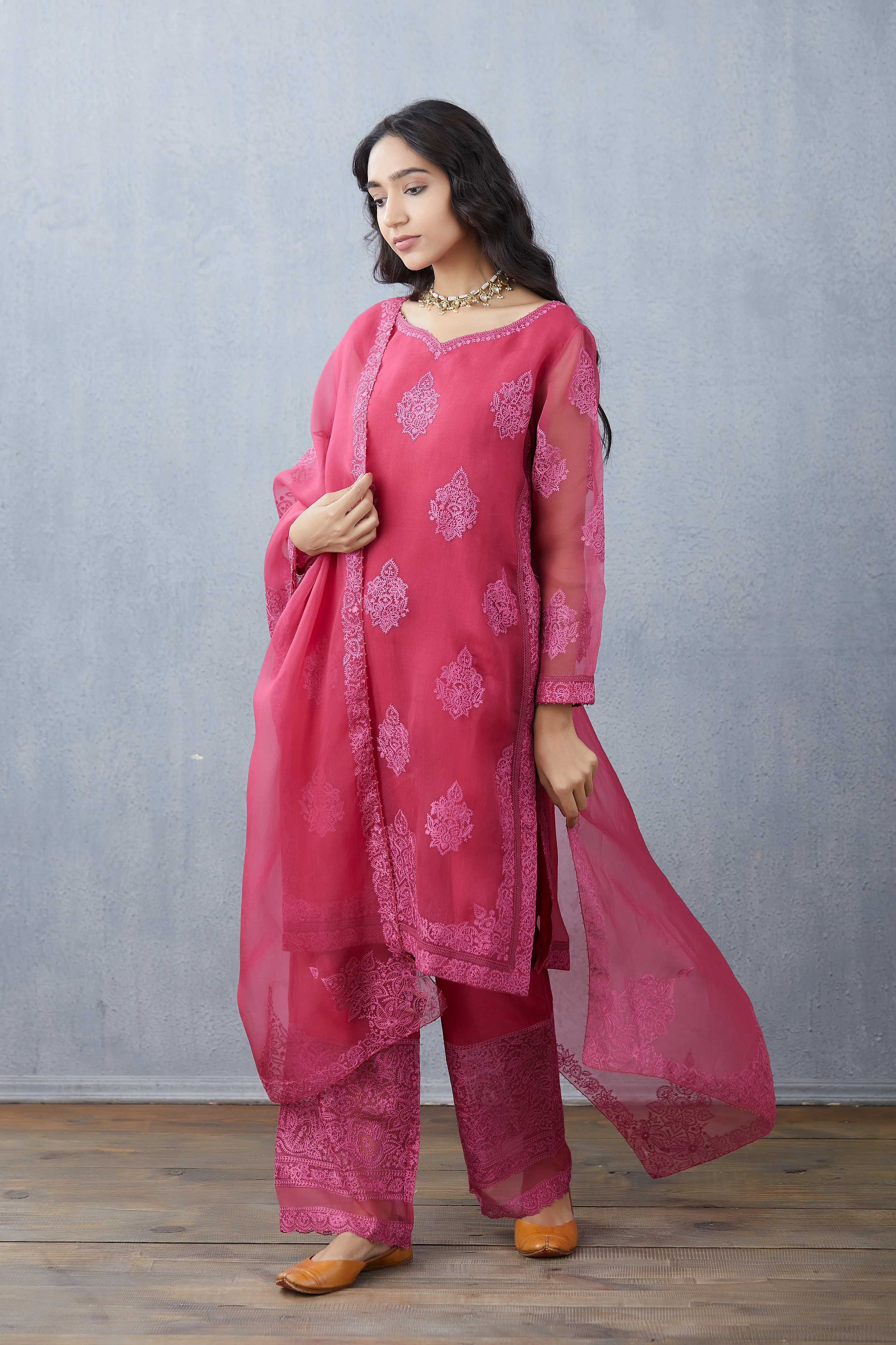 This gorgeous Gulkand Aadrita Kurta Set elegantly combines a luxurious tulle, silk organza, and handwoven chanderi fabric for an exquisite look. Featuring eye-catching machine and hand embroidery, this scarlet set is perfect for any special occasion.