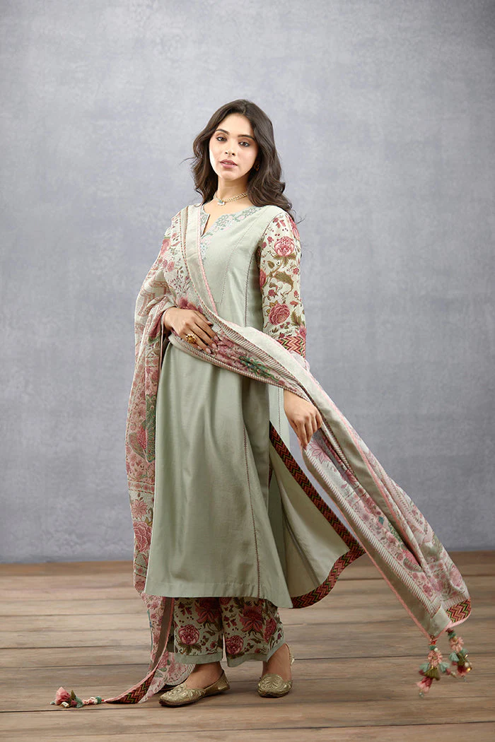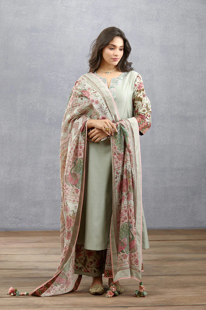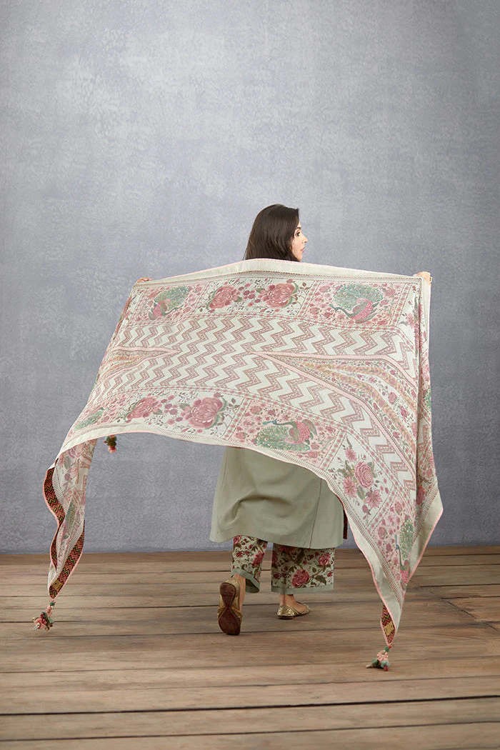 The Jaituni Ambiya Odhni is an opulent Odhni crafted from Handwoven Thin Chanderi fabric, featuring a beautiful sage green paisley print. Intricately printed by state-of-the-art digital printing techniques, this Odhni is a perfect addition to any special occasion or festive wardrobe.