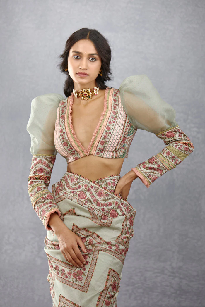 This Jaituni Dhara Blouse, made from handwoven Chanderi and Silk Organza fabrics, is perfect for creating a classic, everyday look with a modern twist. The unique combination of digital printing and hand block printing gives an interesting texture to the green color. Enjoy the perfect combination of traditional and contemporary styles with this eye-catching and versatile blouse.