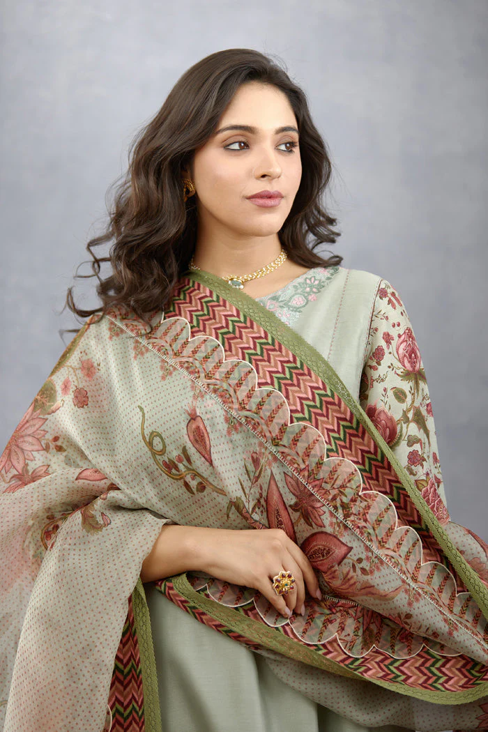 Experience the richness of Jaituni Kalika Odhni, a Silk Organza Odhni featuring a chic green hue and a graceful sage green floral print. Carefully crafted with Digital printing, it's perfect for special occasions.