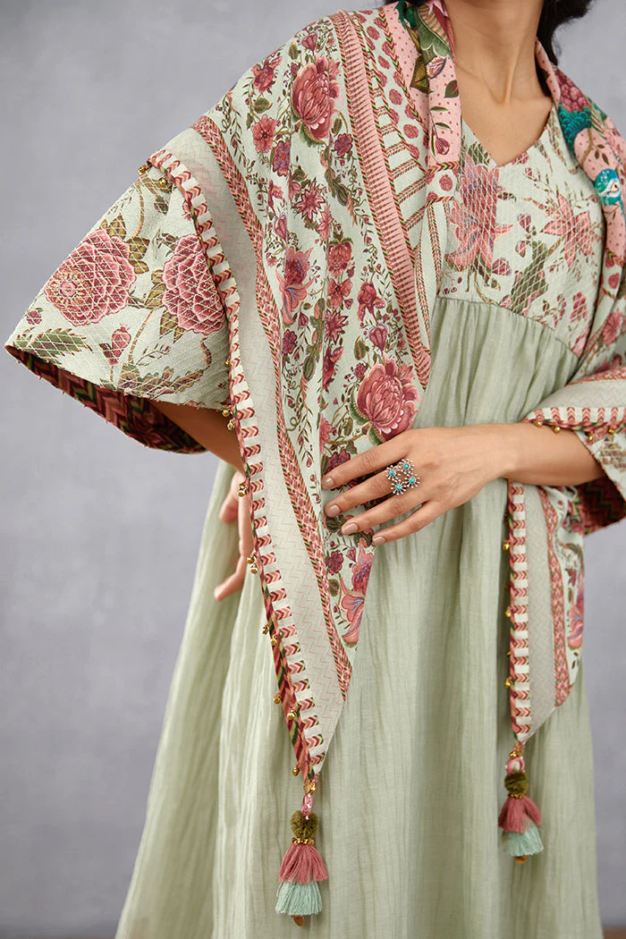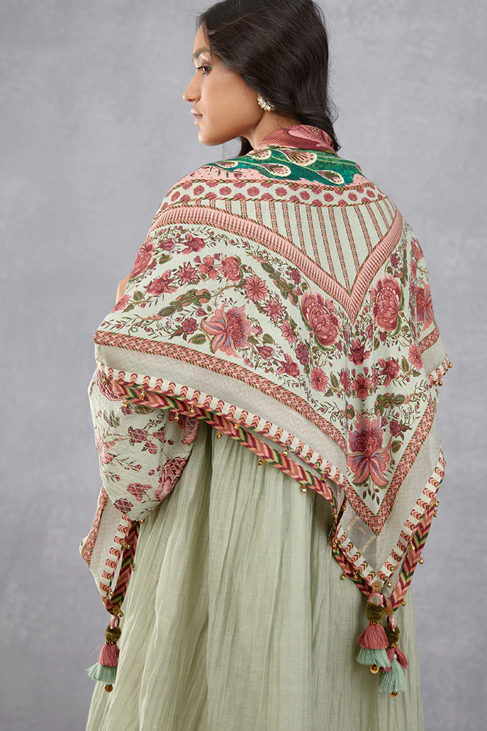 This Jaituni Mayuri Scarf features an eye-catching sage green Chintz printed pattern in a luxurious Cotton Silk fabric. In a vibrant green hue, this scarf was Digitally printed to provide a perfect finish. With natural breathability and soft texture, this scarf is a stylish and comfortable accessory.