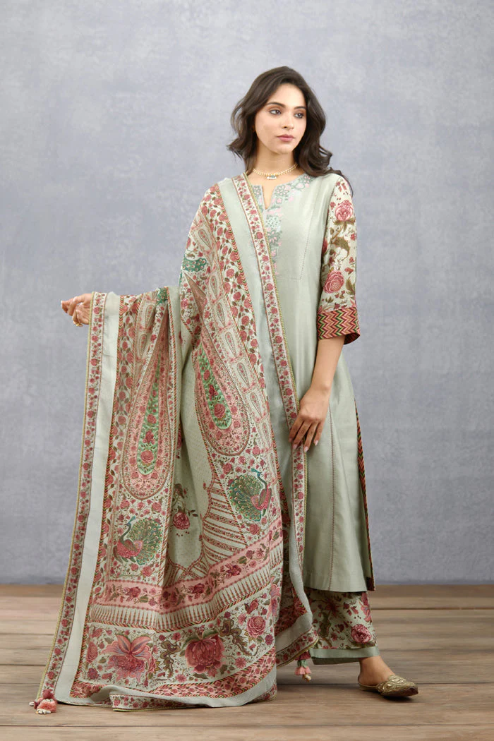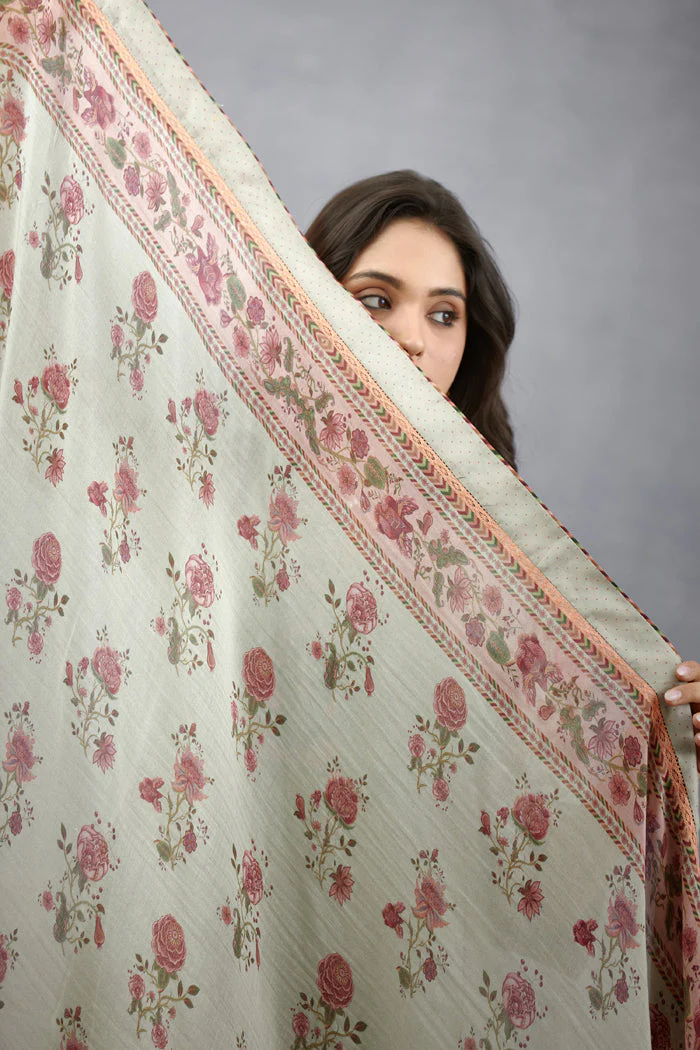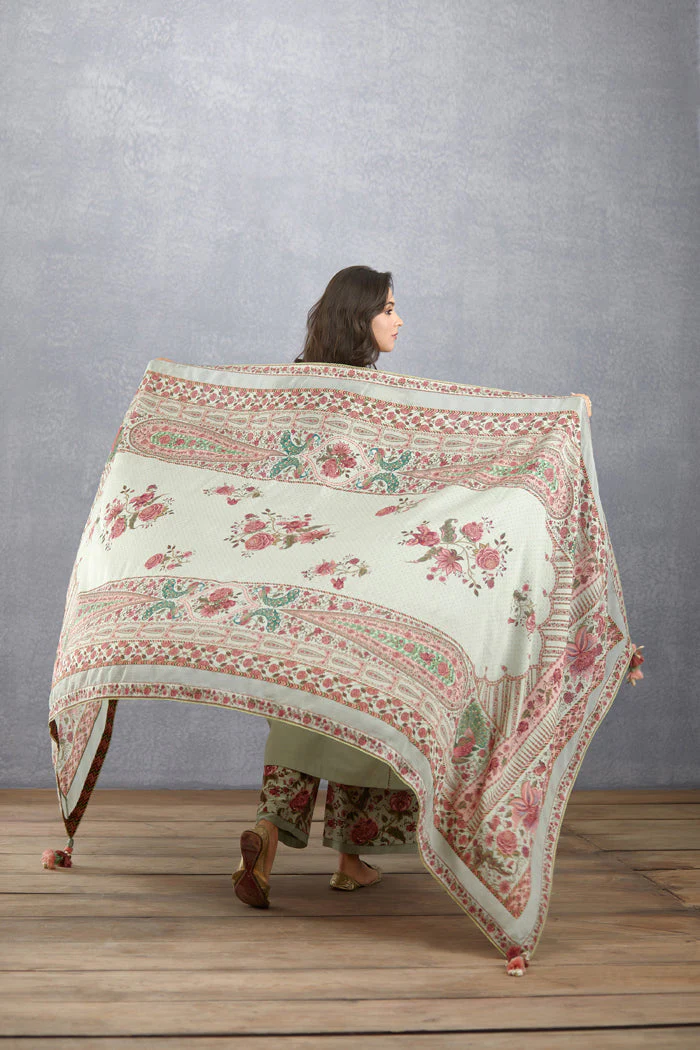 This exquisite Jaituni Sumukhi Odhni is a masterpiece of craftsmanship. Handwoven in the finest Thin Chanderi fabric, it features a sage green center scallop Chintz print with an green background. Digital print work brings this delicate piece to life.