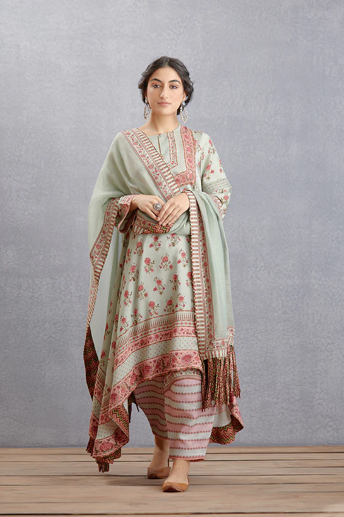Dress for your next special occasion in this Jaituni Tarangini Kurta Set. Crafted from linen, this sage green chintz printed A-line set is complemented by a handwoven thin chanderi odhani in a beautiful green color. The digital print enhances the overall look and feel of the set. Put together elegance and style with this fashionable piece.