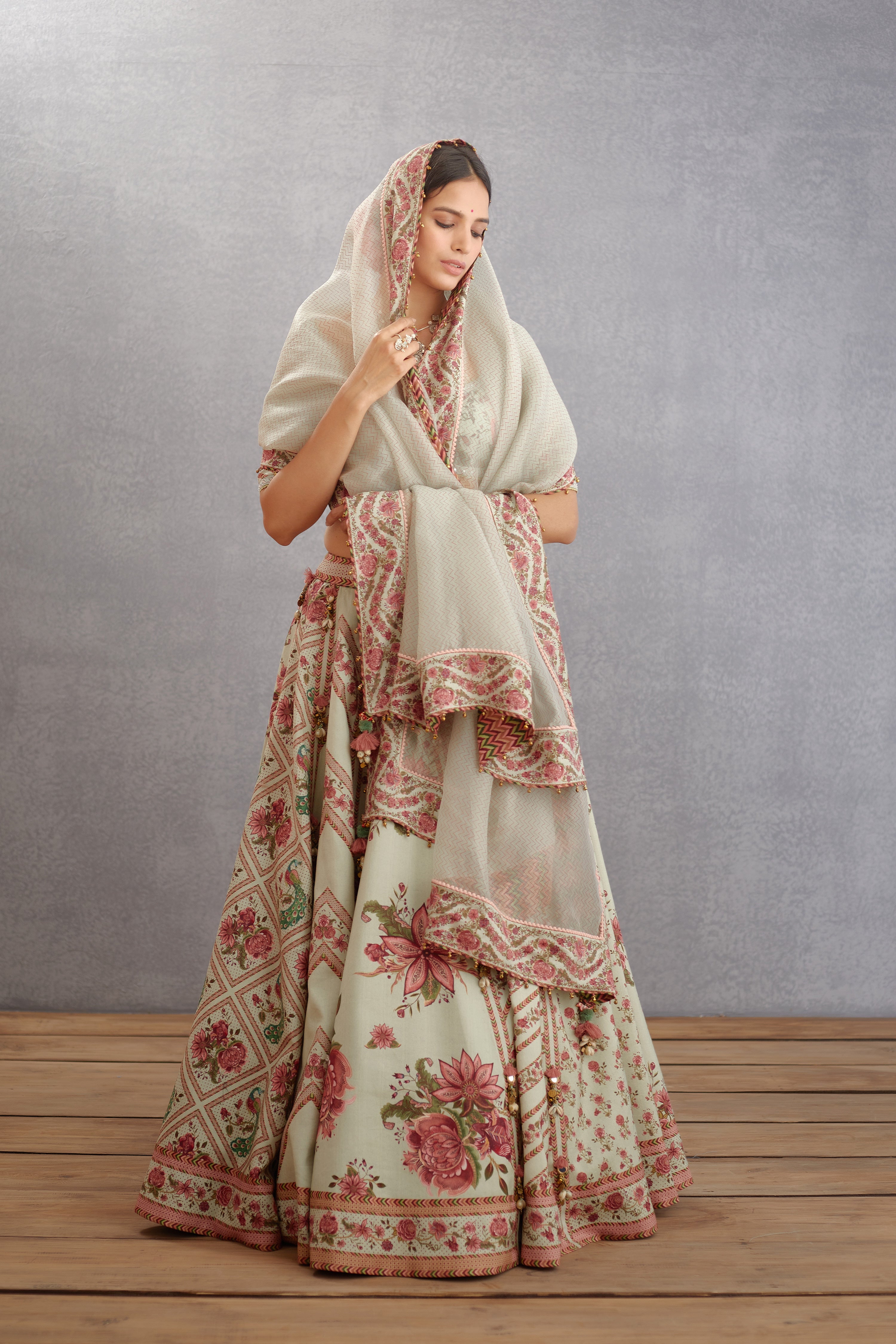 The Jaituni Waheeda Odhni presents a striking combination of classic style and modern craftsmanship. The Hand Block Chevron print is complemented by a green digital print, with both designs applied to a luxurious Silk Organza fabric. Enjoy the elegant style of this sage green Odhni for an eye-catching look.
