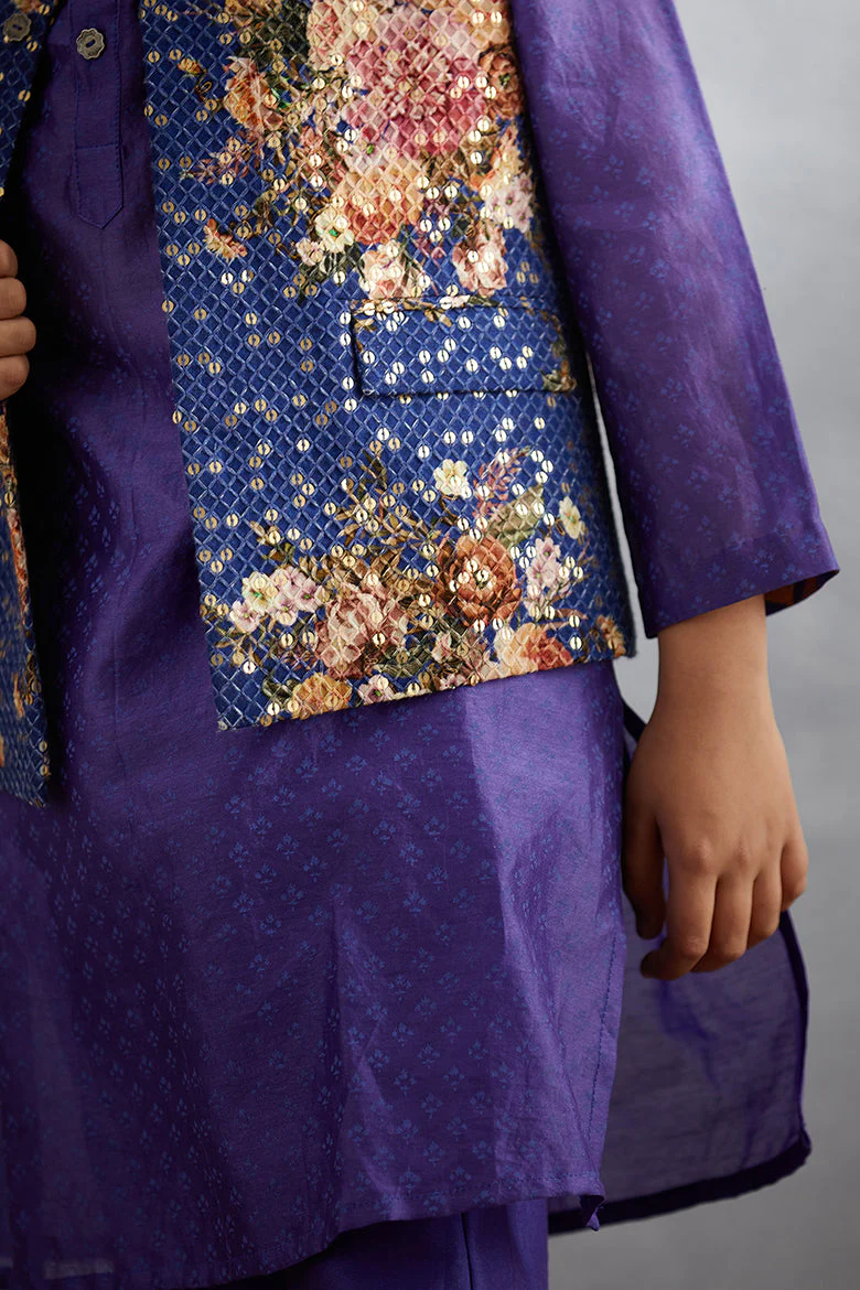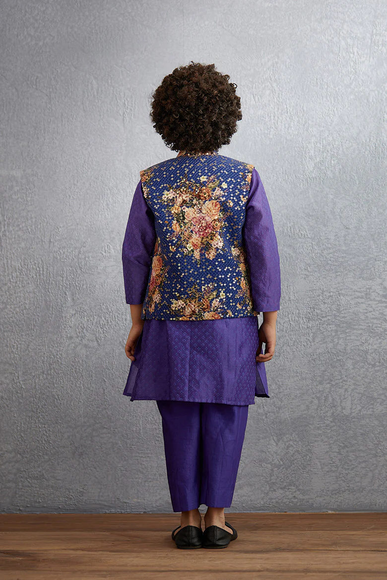 Stay stylish in any season with this Jamuni Qasiba Sitara Bandi Set. Crafted with the finest handwoven Chanderi and Cotton Silk fabric, this set includes a Bandi, Kurta, and Pants in a beautiful purple hue. Tailored with intricate hand embroidery, you'll make a lasting impression.