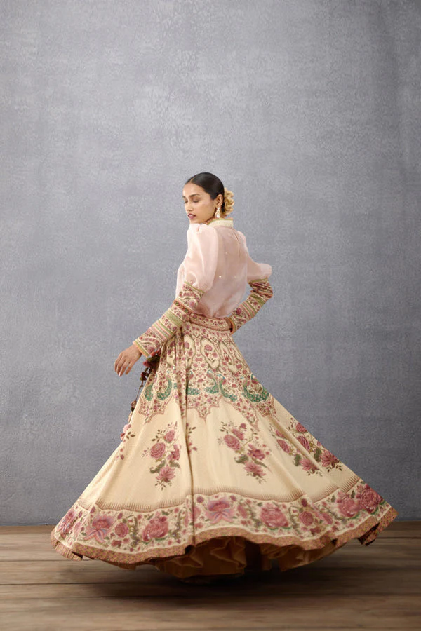 Look captivating in this Kaner Kasturi Mubina Lehenga Set. Crafted from beige handwoven Chanderi fabric, it features a digital print placement printed skirt, a sheer silk Organza blouse in pink, and a striped Cotton Silk bralette. This ensemble comes alive with handwork and machine embroidery. Exude charm at your special event with this timeless piece.