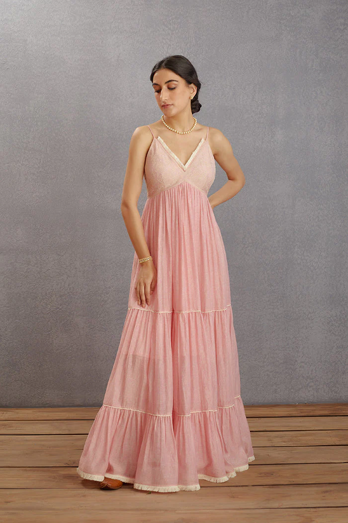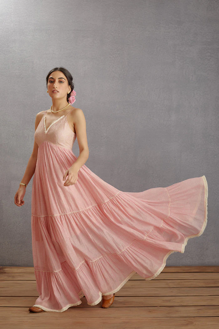 Look stunning in the classic and elegant Kaner Rabia Julaba Ghera. This long dress in Old Rose Pink is expertly crafted from Handwoven Chanderi and Handwoven Thin Chanderi, featuring Aari Embroidery for a timeless, alluring look. Perfect for any occasion, this dress is sure to make a statement.
