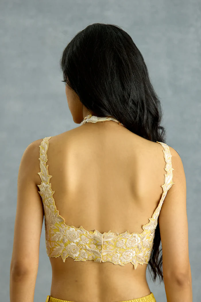 Minimal yet intricate, the Kasmai Noor Bralette is crafted in silk and detailed with subtle tonal embroidery. Its soft structure complements the jacket while allowing the ensemble to remain fluid, breathable, and modern—an understated anchor to the look.