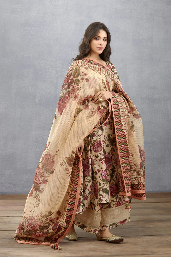 This Kasturi Kalika Odhni is crafted from luxurious Silk Organza fabric in a delicate shade of beige. Featuring a stunning floral digital print, this Odhni will add a sublime touch to any look.