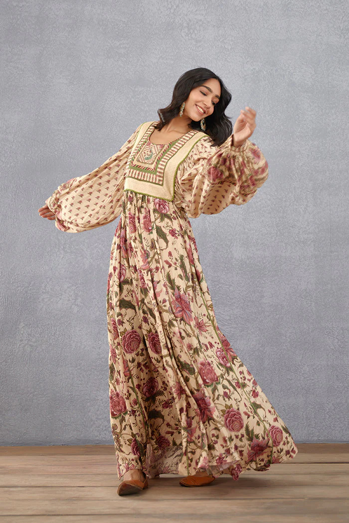 Introducing the Kasturi Lalika Dress, a ballet-length Anarkali crafted from handwoven Chanderi cotton silk, featuring a luxurious musk beige shade and alluring digital print. Its balloon sleeves add a touch of elegance to any ensemble.