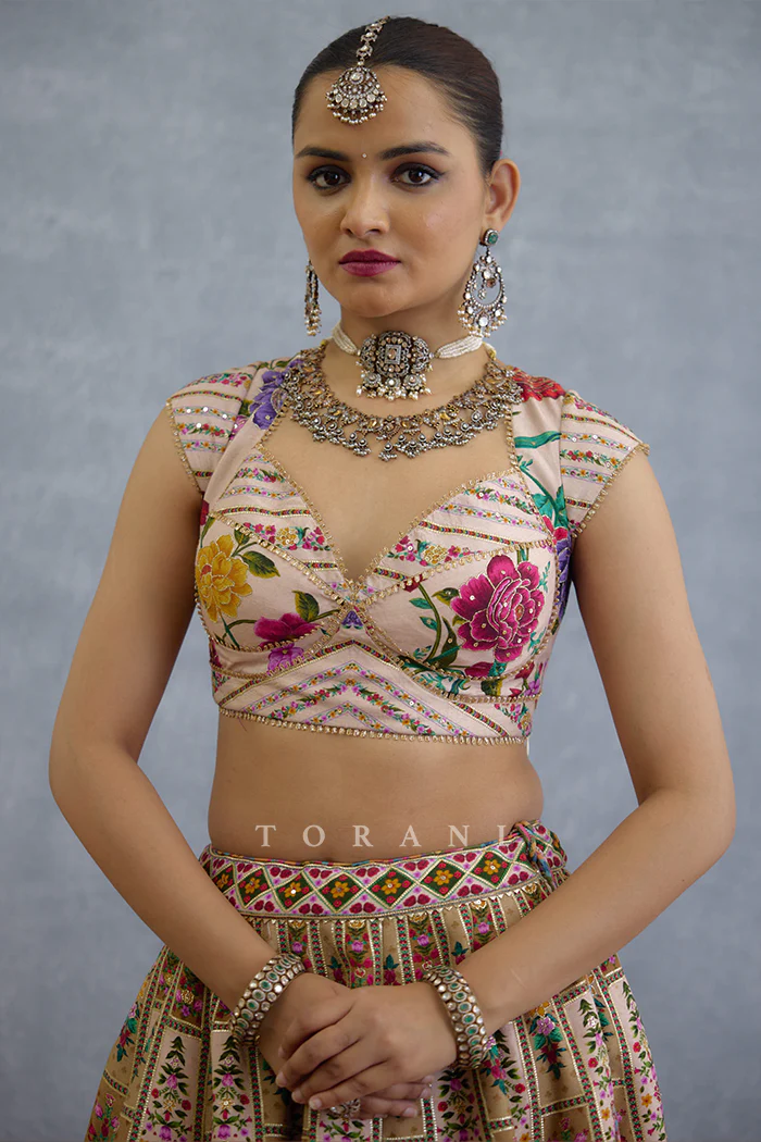 The Kasturi Mihika Lehenga Set is a piece of natural elegance that will turn heads. Crafted using jeni silk and oraganza, this set features a lehenga a blouse and an odhni designed with digital prints.