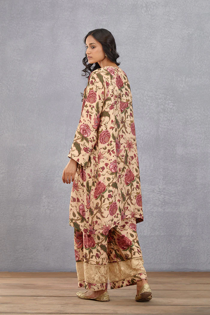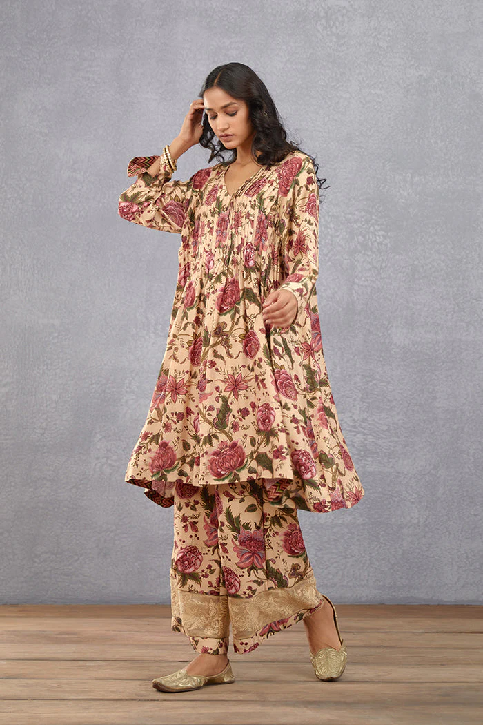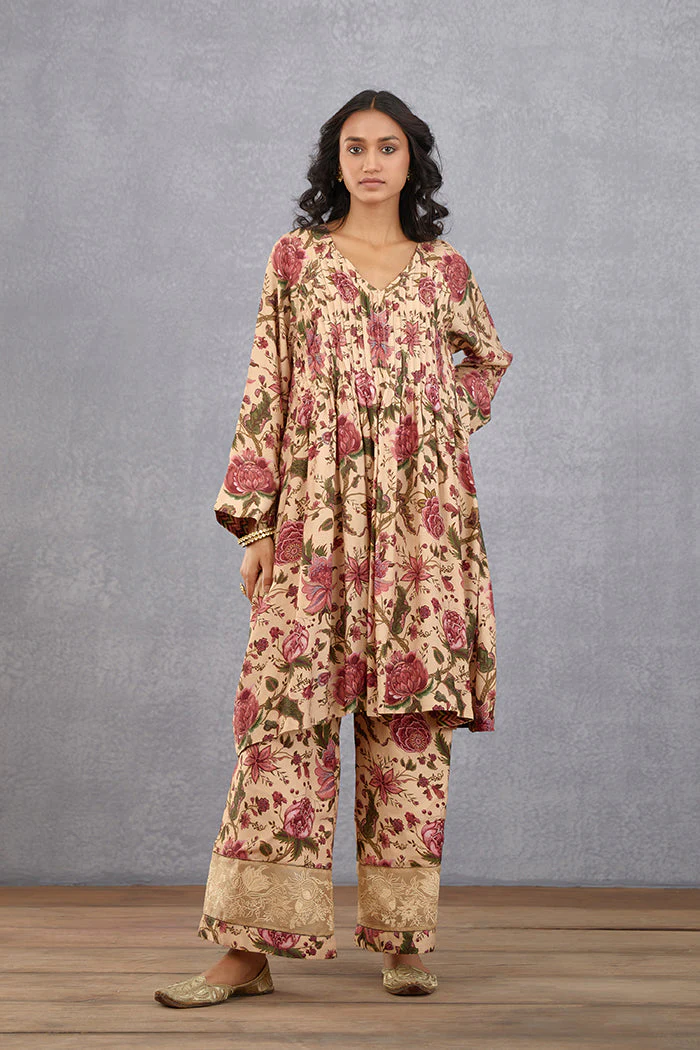 The Kasturi Nazam Co-ord Set is a luxurious wardrobe staple crafted from cotton silk. It features a beige chintz printed pintuck kurta and embroidered pants, making it perfect for any festive or special occasion. The high-grade fabric is durable and comfortable, while the digital print and hand embroidery adds a sophisticated touch. This stunning set is sure to make a statement.