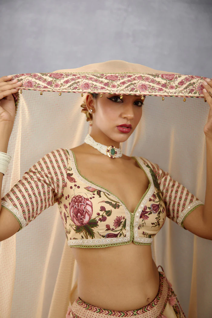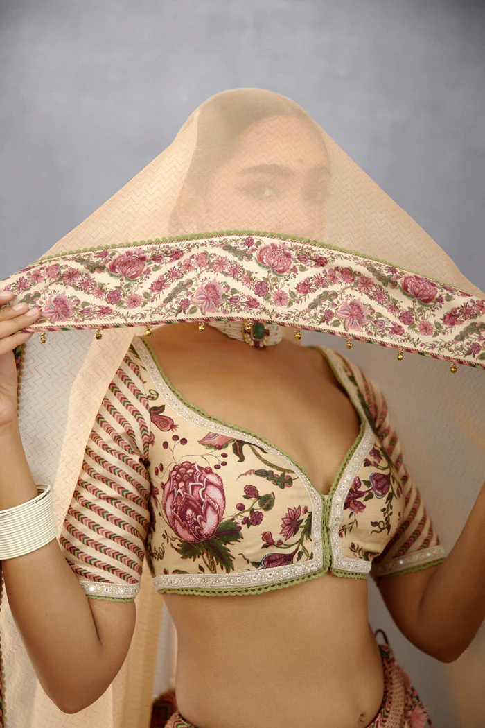 Make a statement with the Kasturi Waheeda Odhni, featuring a musk beige Hand Block Chevron print in lightweight Silk Organza. Digital printed with precision, this Odhni is perfect for occasions that demand effortless sophistication.