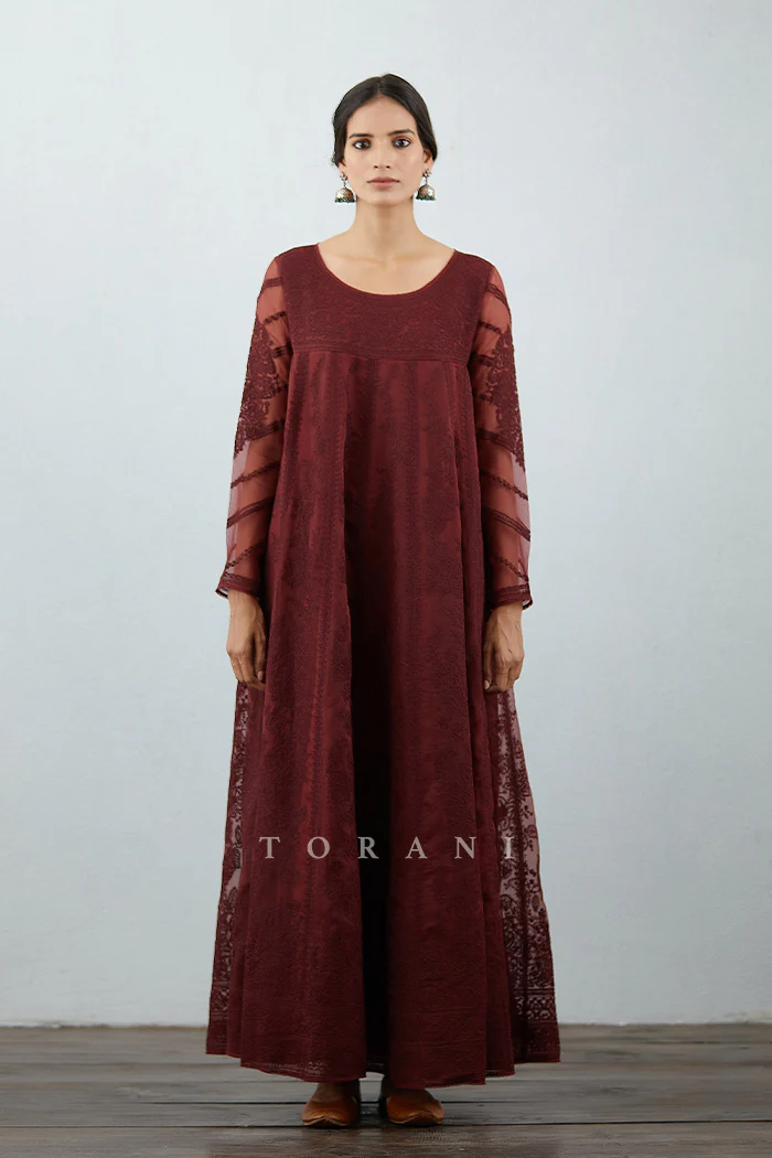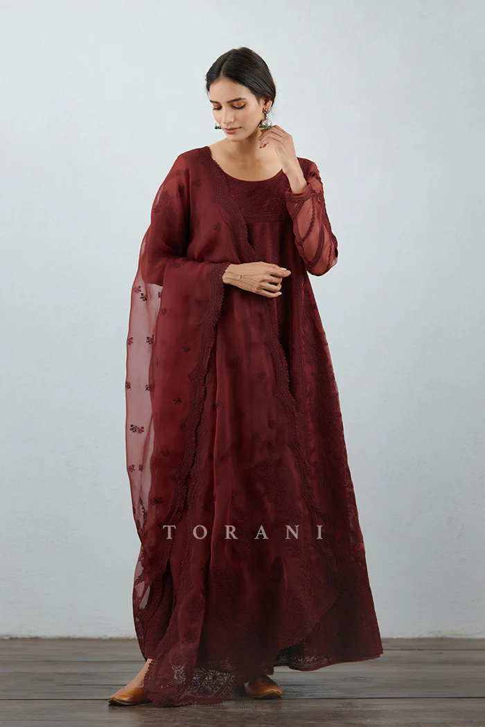 Discover timeless elegance in a classic Mahogany Sutlej Anarkali Set. Crafted from Silk Organza and Cotton Silk, this intricately detailed ensemble features Aari embroidery and a wine hue for a regal look. The set includes a stunning Anarkali and matching Odhni. Bring sophistication to any occasion with this timeless design.