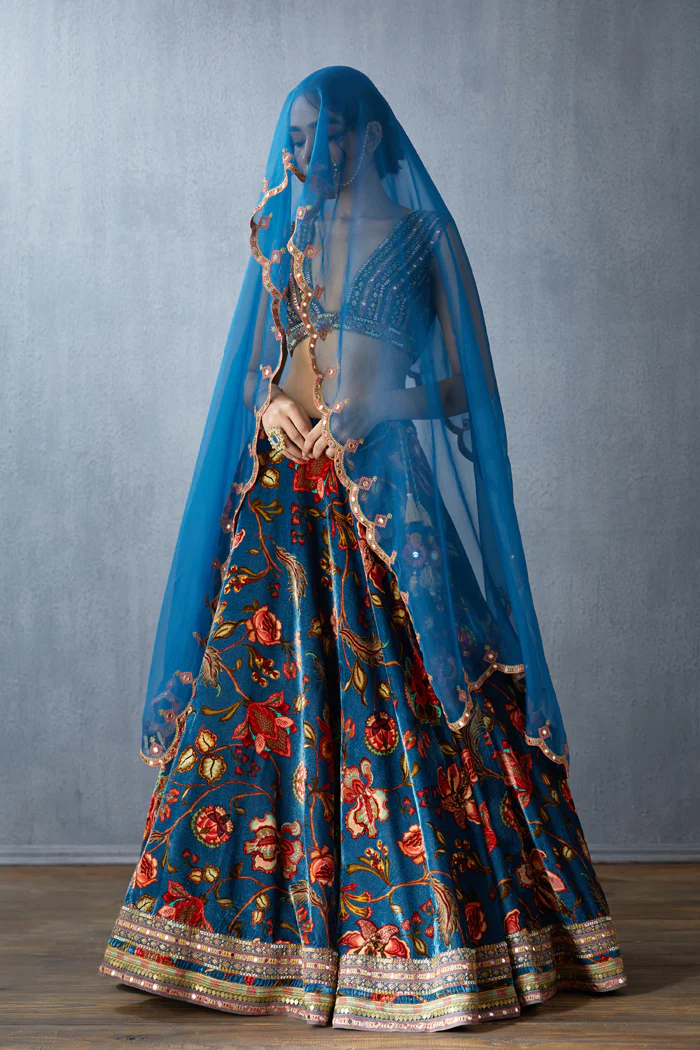 This Neelam Makhmal Waheeda Lehenga Set made of luxurious silk velvet, silk organza, and handwoven chanderi is perfect for making a statement. Featuring a bold blue hue and intricate hand and machine embroidery, it's sure to turn heads with its timeless elegance.