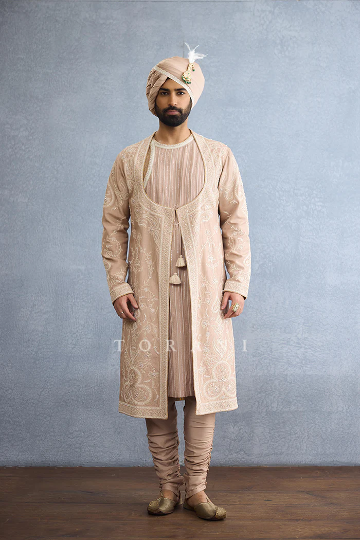 The Noore Azeez Kurta Set is crafted from the finest Jeni silk and muslin silk, featuring a gorgeous rustic peach hue accentuated with golden doria, dabka, and intricate embellishments for a distinctive finish. This set includes a kurta and churidaar, blending heritage traditions with contemporary Indian menswear.