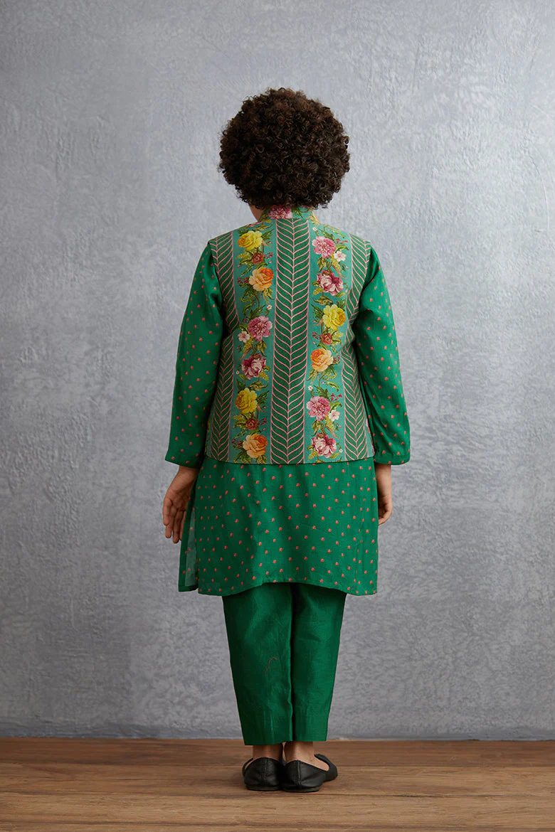 This Panna Gulfam Bandi Set is handcrafted with a blend of Chanderi and Cotton Silk, plus Cotton Voile. The stunning digital print stands out in vibrant green colors, and comes with a bandi, a kurta, and pants for the perfect look.