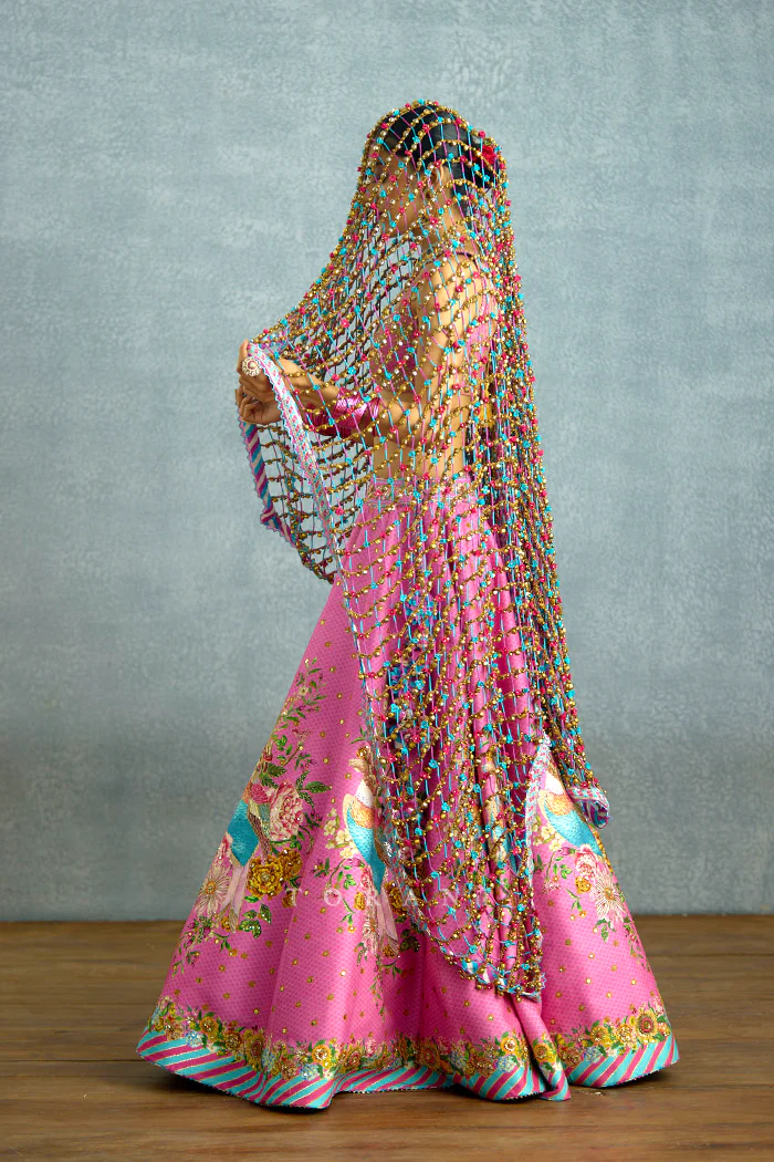 Crafted in vibrant pink silk, the lehenga features digitally printed florals brought to life with delicate hand embroidery layered over the print. A playful striped hem adds rhythm to its voluminous silhouette, creating a look that is joyful, festive, and refined. Entirely handcrafted, this piece transitions effortlessly from day celebrations to evening soirées, making it ideal for bridesmaid wear.