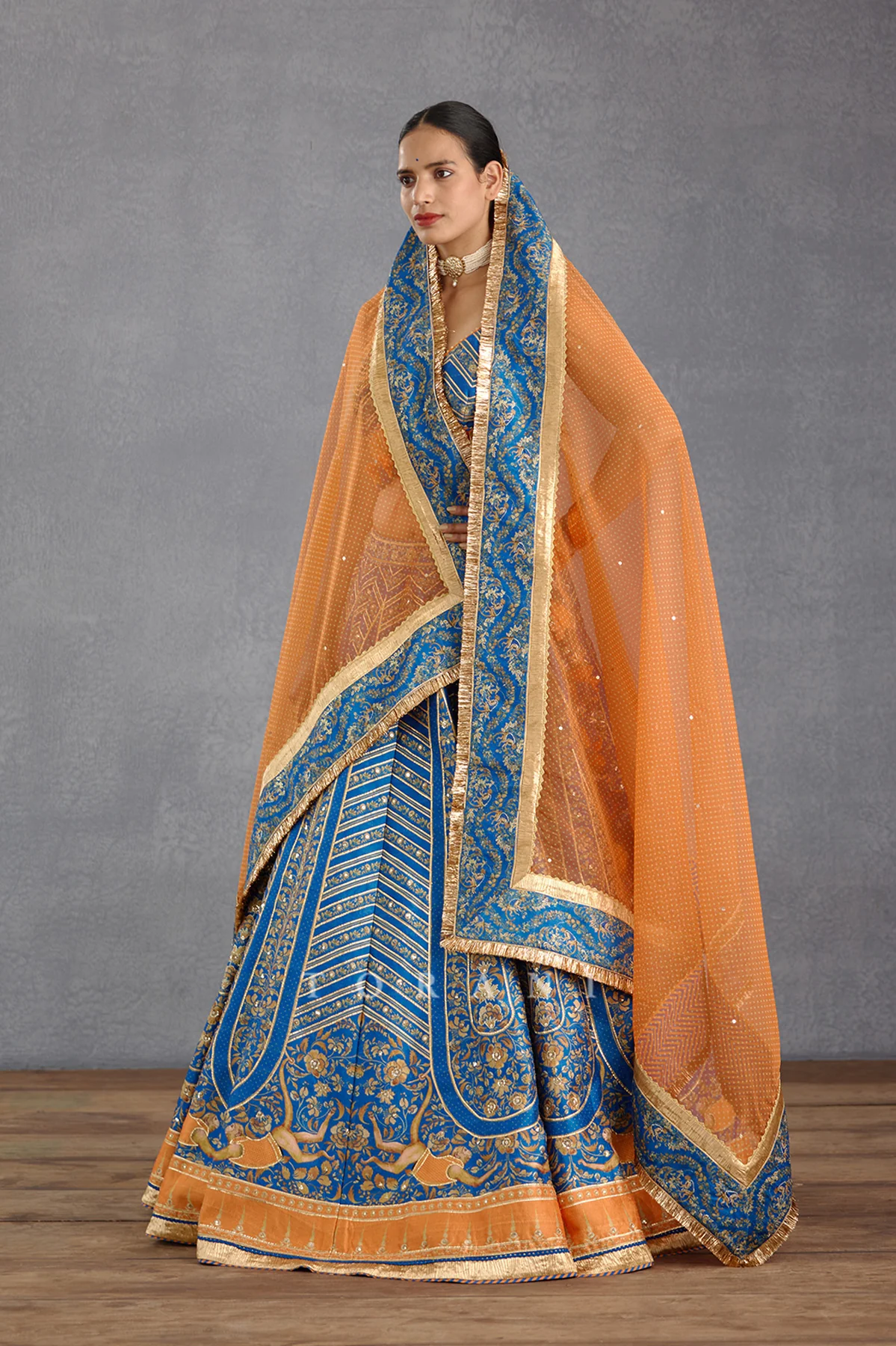 The Rang Shyam Hayat Lehenga Set is an eye-catching piece crafted in Persian Blue Bhagalpuri Printed Silk, featuring heavy tassel strings with Gota embroidery, Hand Adda Work, and Bhagalpuri digital print. The bold colors of blue and orange add a vibrant touch to this one-of-a-kind set.