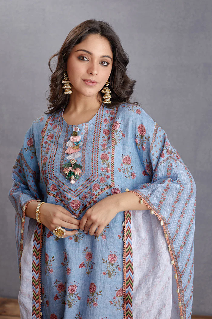 This Samsara Aarfa Kaftan is the perfect way to stay stylish and comfortable all day. Expertly crafted from linen, this kaftan is adorned with a striking sea blue chintz print. It is perfect for any occasion and its digital print provides a long-lasting, high-quality finish.