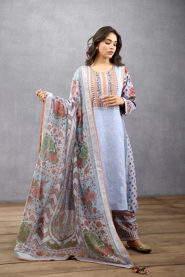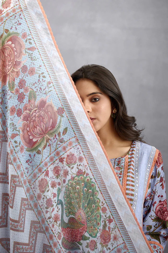 Experience the elegance of the Samsara Ambiya Odhni in blue paisley print. Crafted with Handwoven Thin Chanderi fabric, this Odhni is printed with a digital technique to provide sublime visual appeal. Perfect for any special occasion, this blue Odhni makes an effortless style statement.