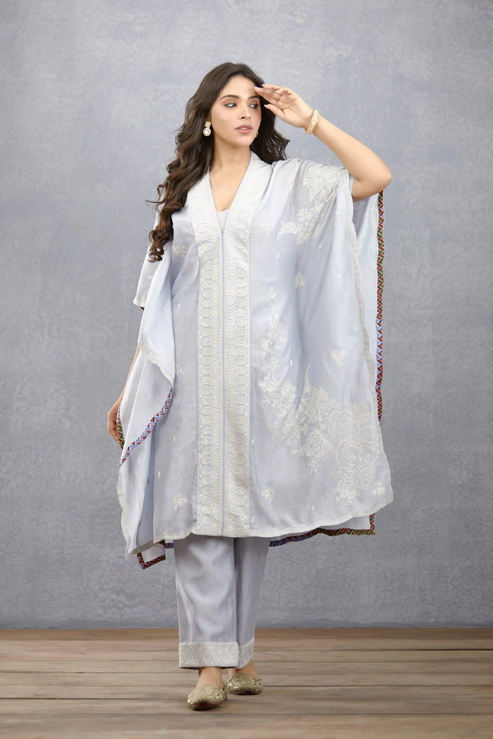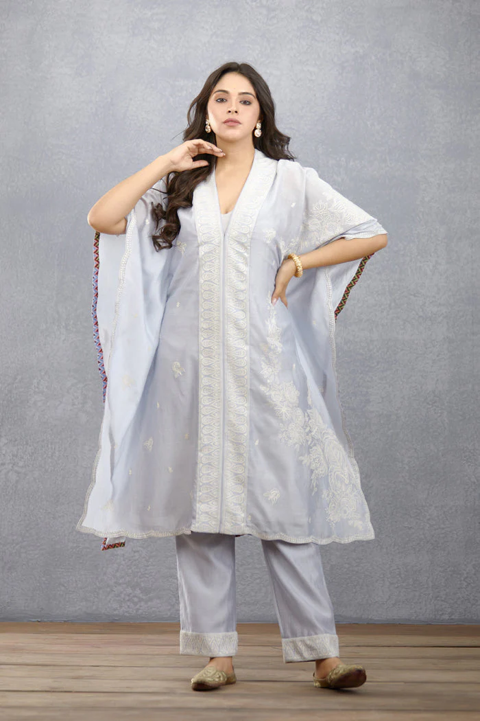 This Samsara Aqsa Kameez Kaftan Set is perfect for any special occasion. This beautiful sea blue set includes a Kameez Kaftan, made from handwoven Chanderi and cotton silk, and a slip in handwoven Chanderi. The intricate Aari embroidery elevates the beauty of this elegant set.