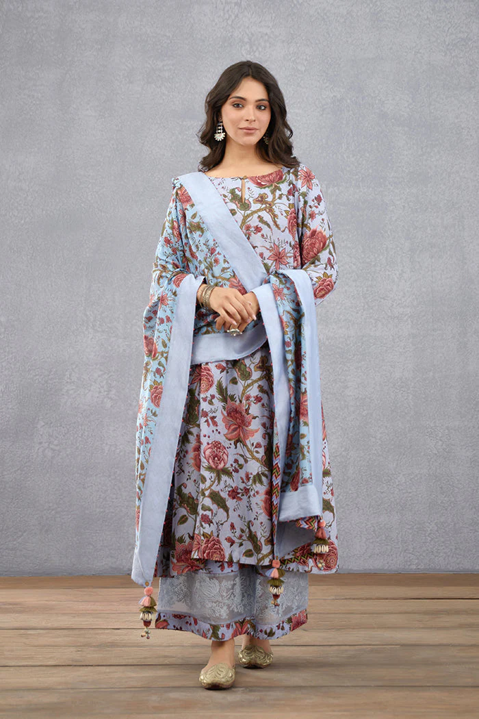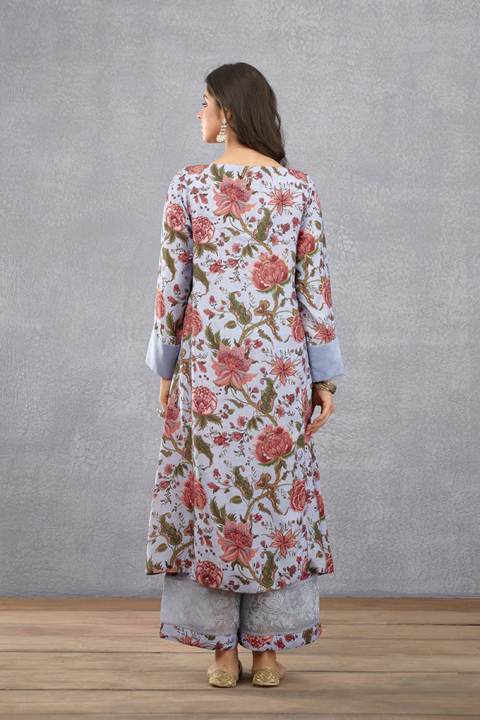 Achieve effortless style with the Samsara Aroha Kurta Set. Crafted from the finest quality cotton silk and silk organza and featuring a beautiful sea blue chintz print, the set includes a keyhole kurta, embroidered pants, and a handwoven Chanderi odhani to add extra charm. The intricate digital print and hand embroidery make this garb a stunning addition to your wardrobe.